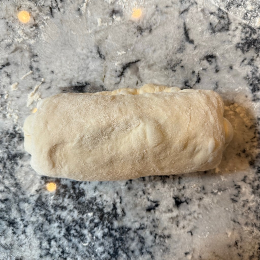 Next, I kneaded the dough by hand for 5 minutes. At the beginning of kneading the butter was still in chunks, but I worked them in as I came across them in the dough. I thought the kneading was done around 2 minutes in, which may be because I’m more used to making minimally kneaded artisanal-style breads. I kept kneading for the full 5 minutes, adding flour as needed, and I was surprised by how much bounce the dough gained as I worked it.