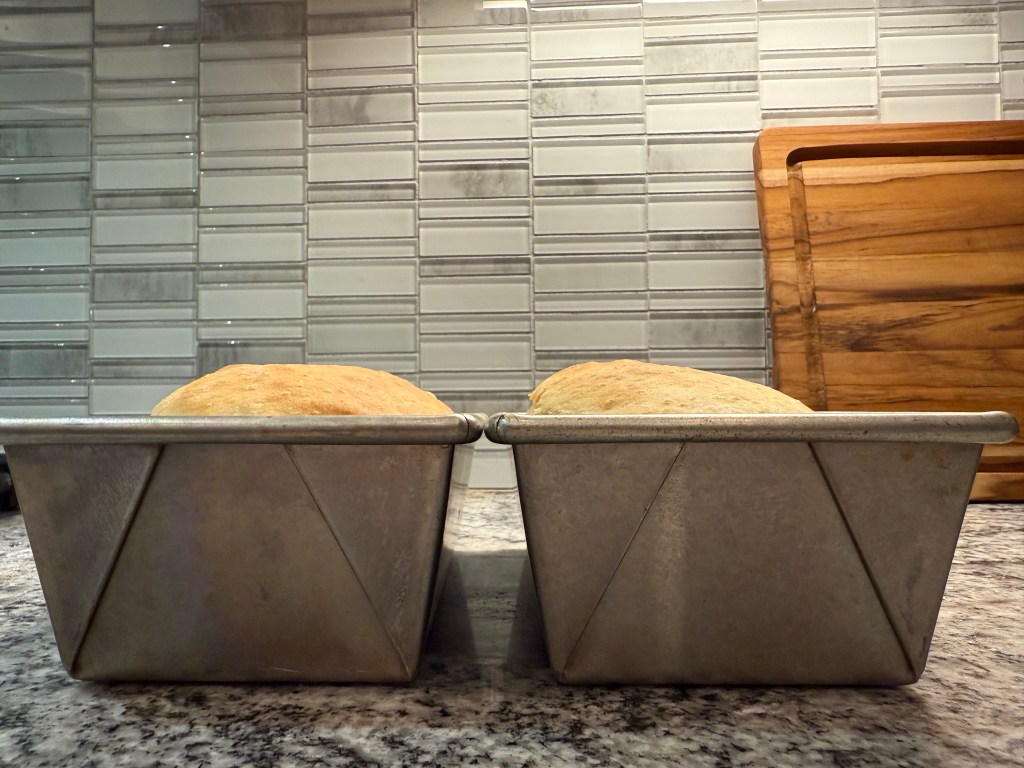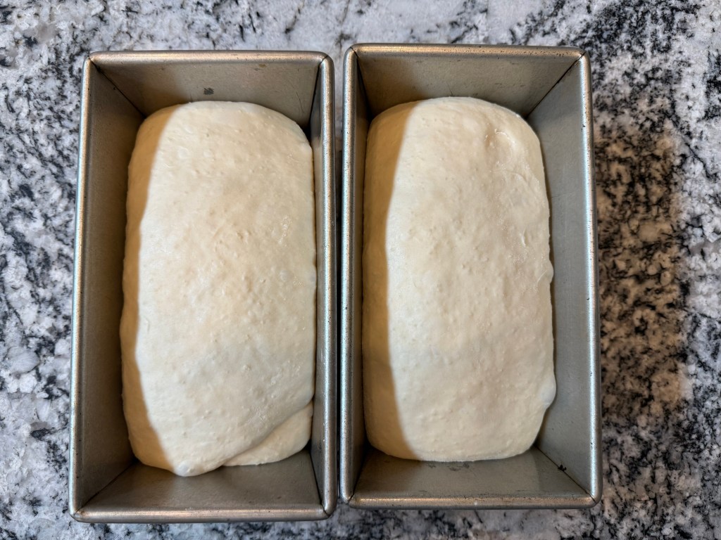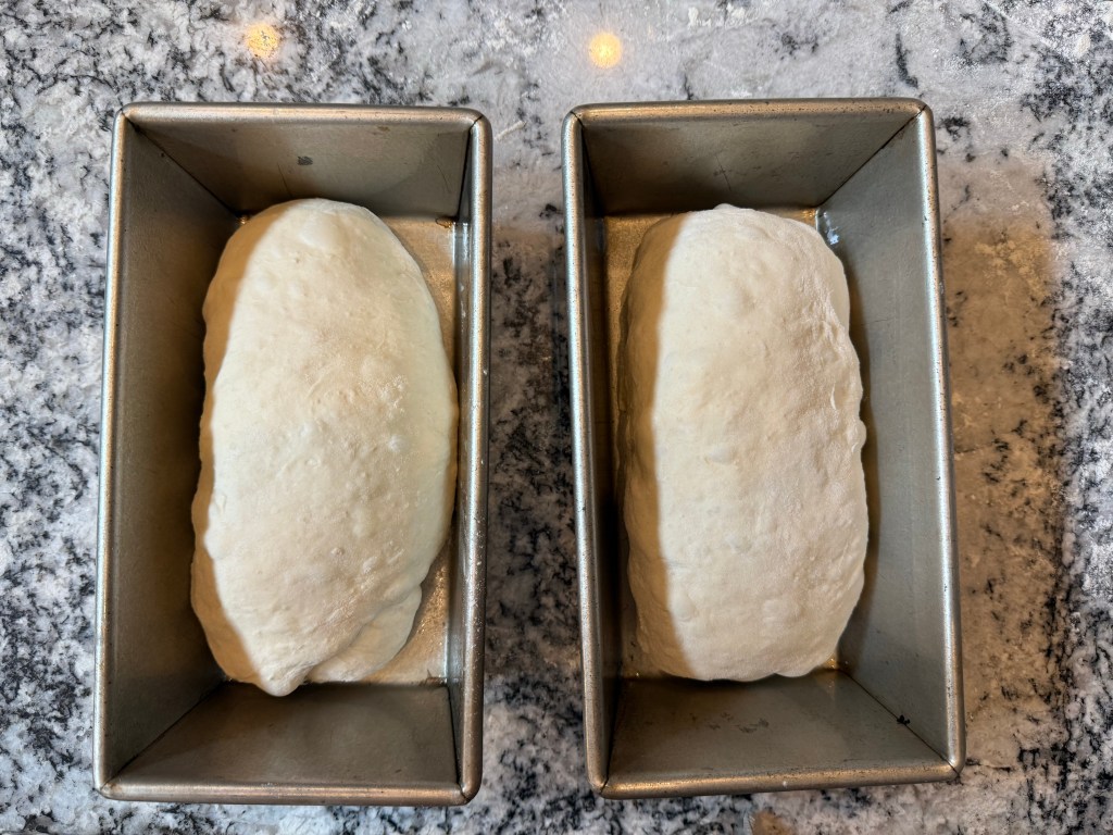 I placed both shaped loaves into greased pans (I greased the pans before dividing the dough), covered the pans, and left them to rise.