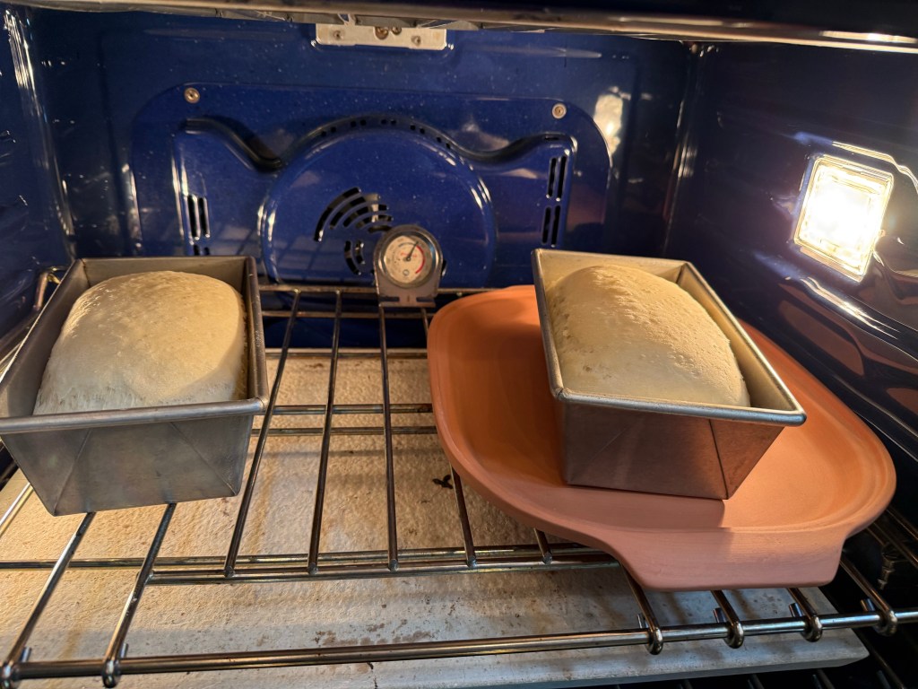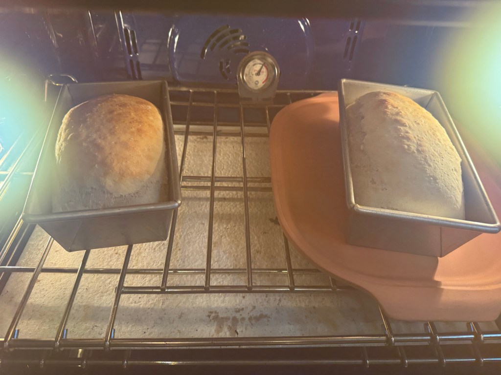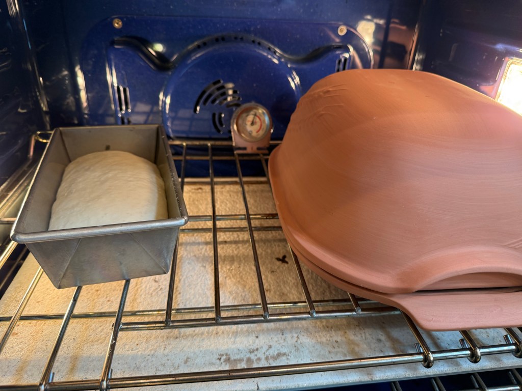 The recipe says the final rise can take 45-90 minutes, which is quite a range of times! My kitchen is rather warm (74 degrees F), so I expected the final rise to be on the shorter end of that spectrum and began preheating my oven immediately after shaping the loaves. I decided to do an experiment in the oven: one loaf would bake regularly in the open oven, and the other would bake inside my clay bread baker. I wanted to see if trapping the steam from the dough would impact the oven spring and how big the impact would be. I do also have a baking stone on the lower rack of my oven for increased thermal mass.