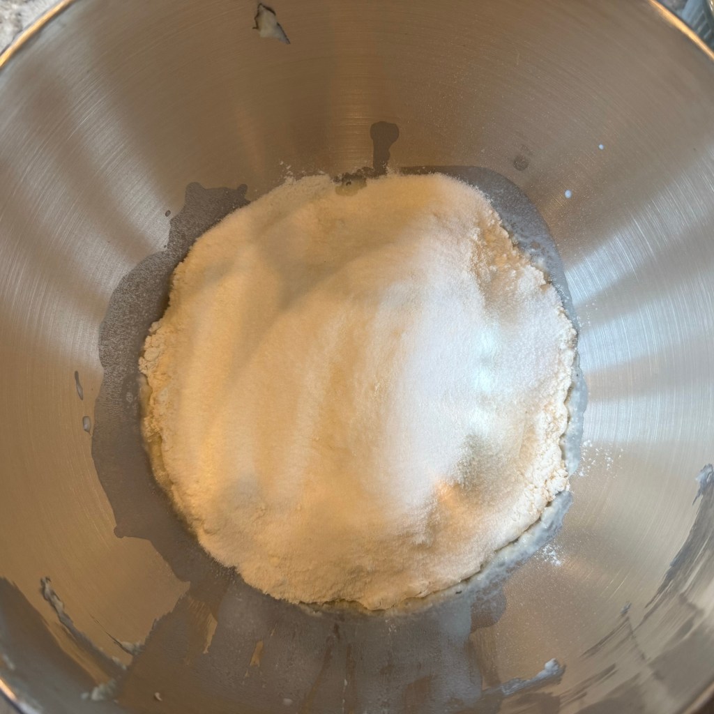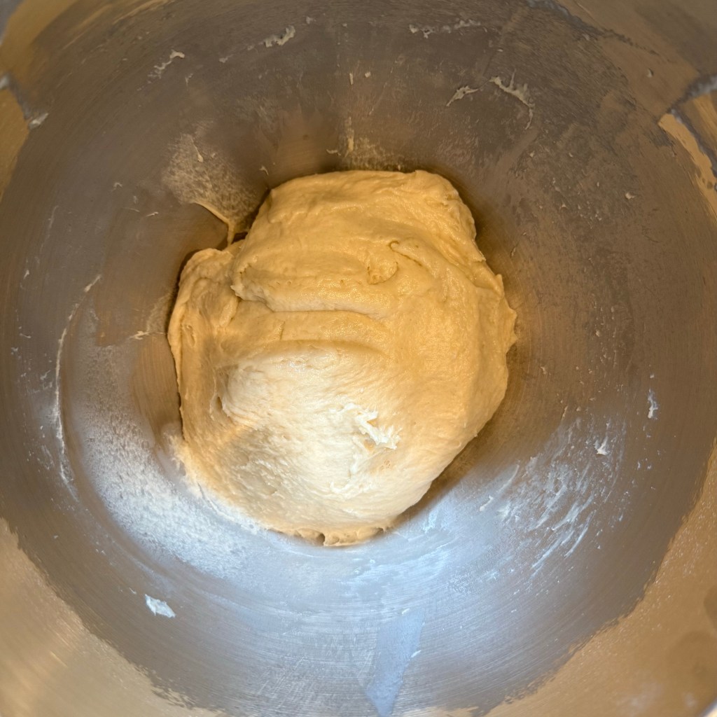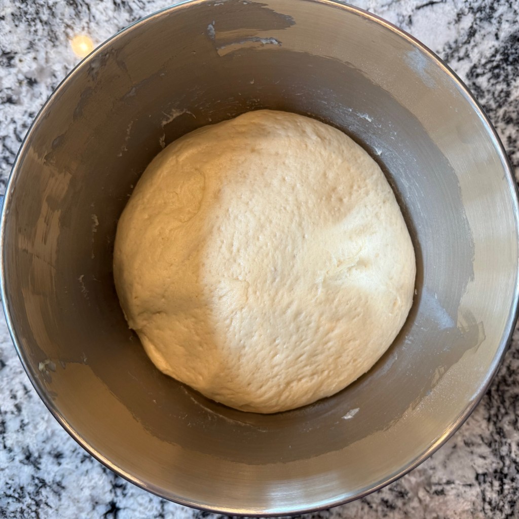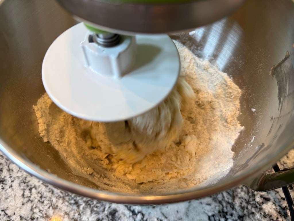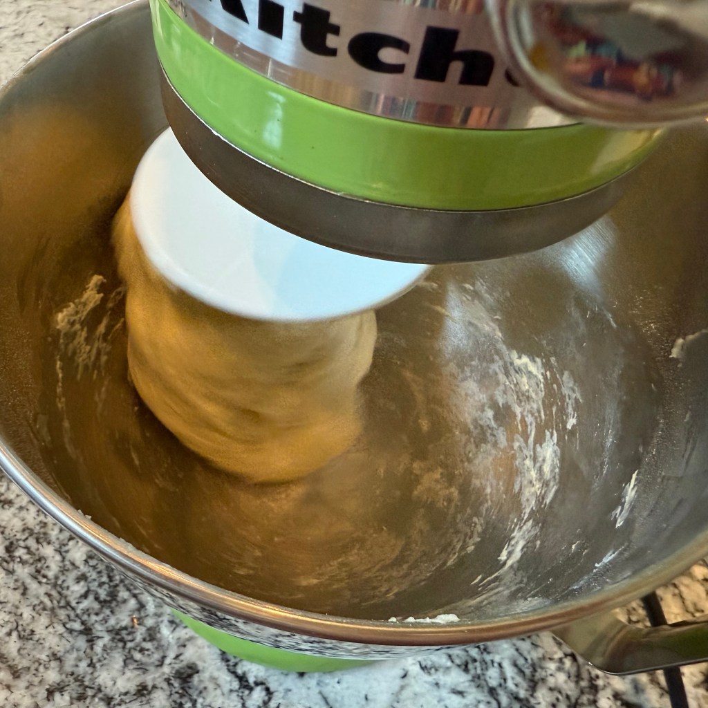 I mixed the ingredients together on my KitchenAid mixer on the “stir” setting for 3 minutes, then on speed 4 for 5 minutes, then set the dough aside to rest.