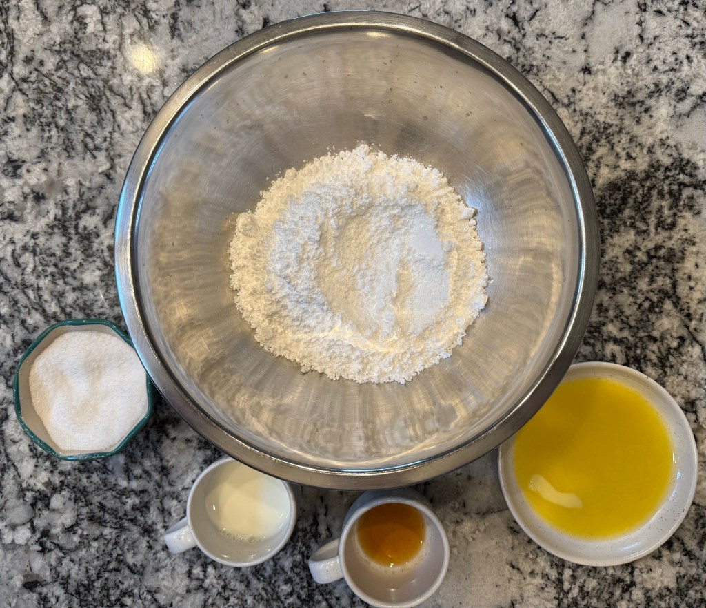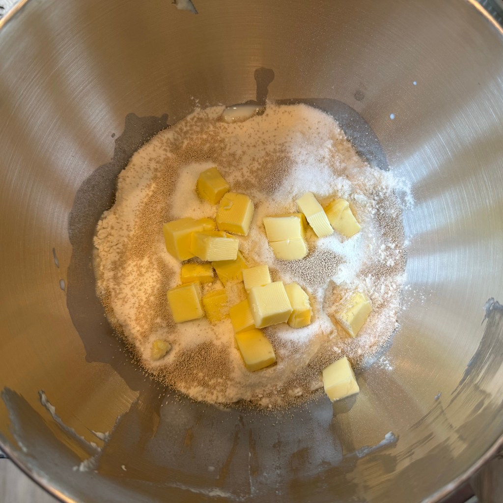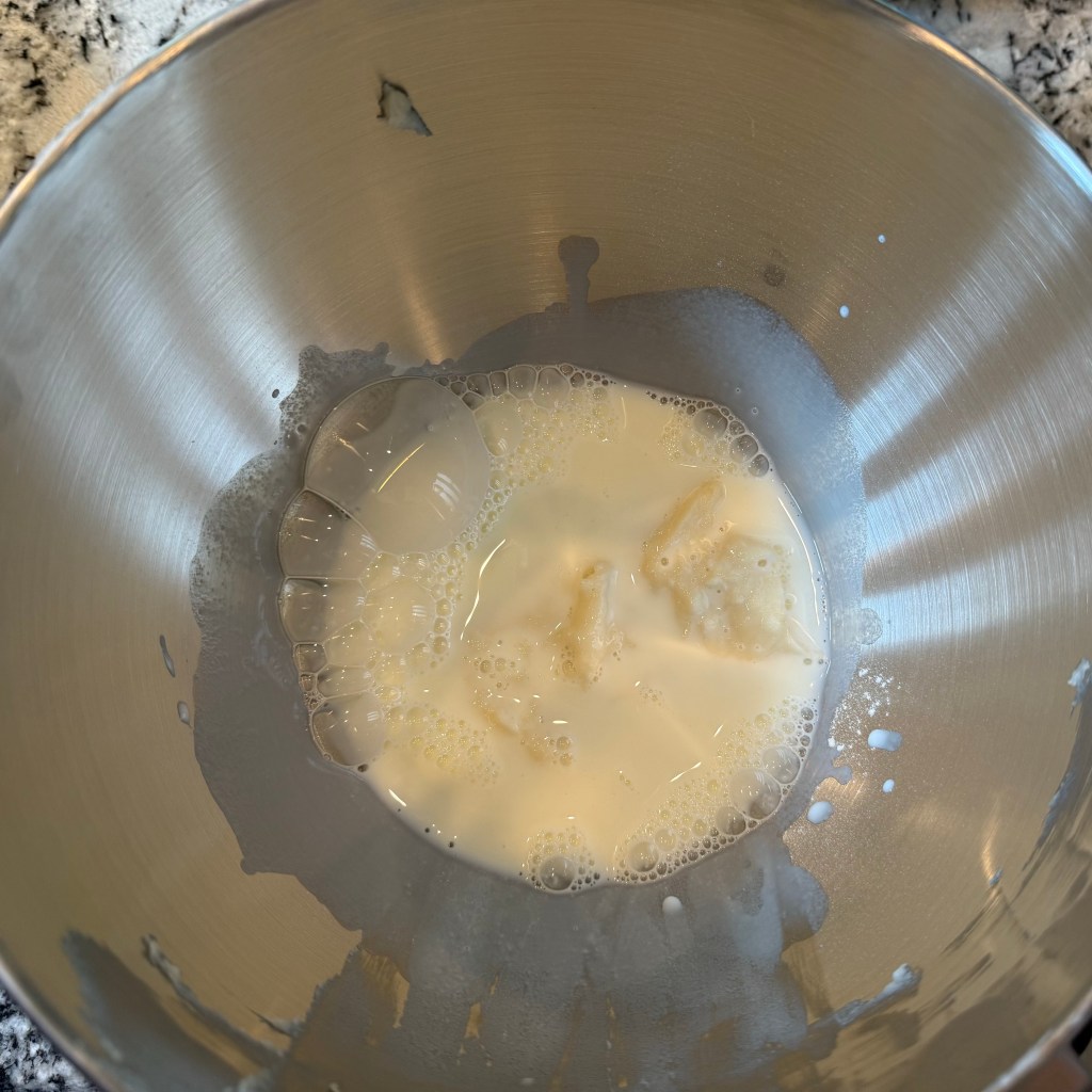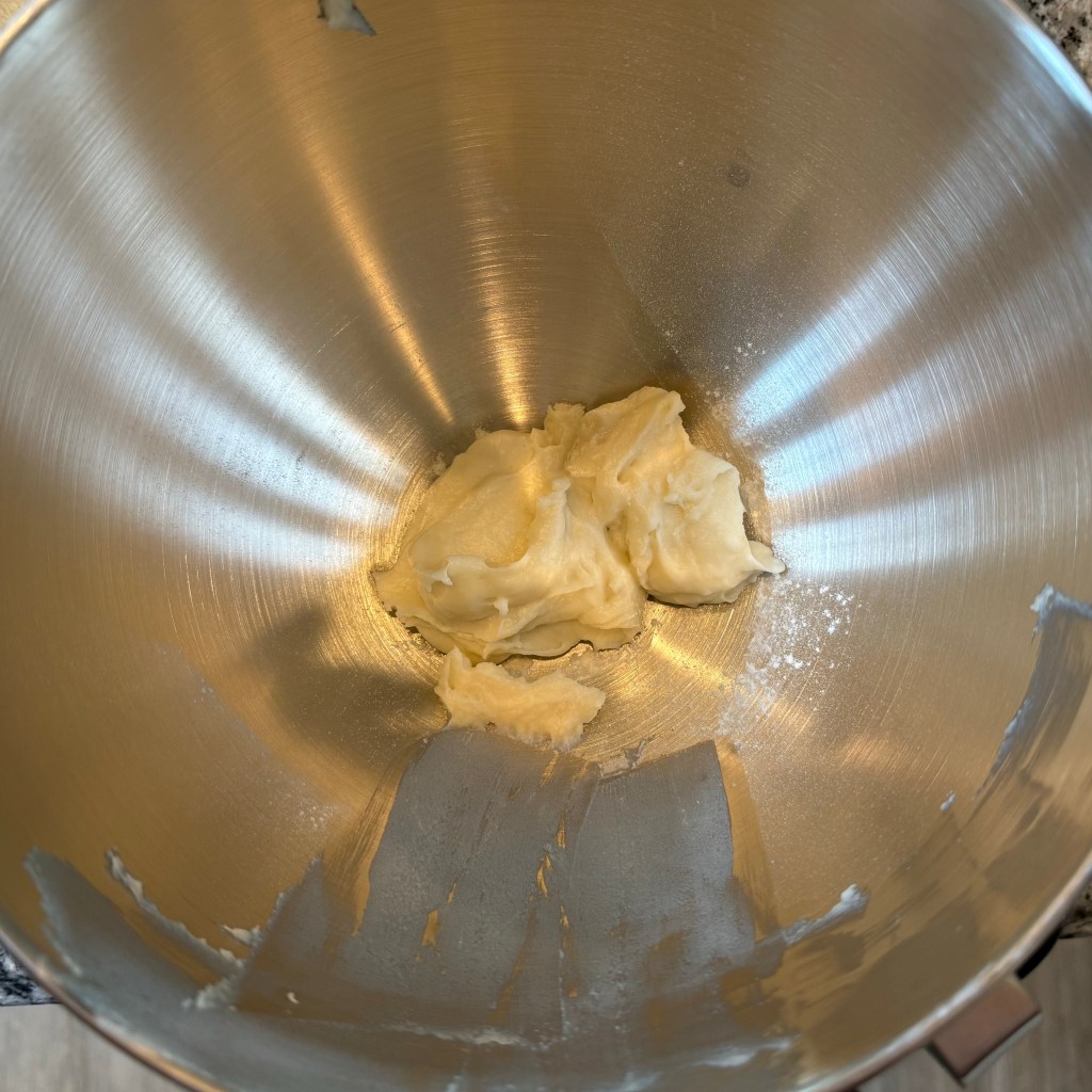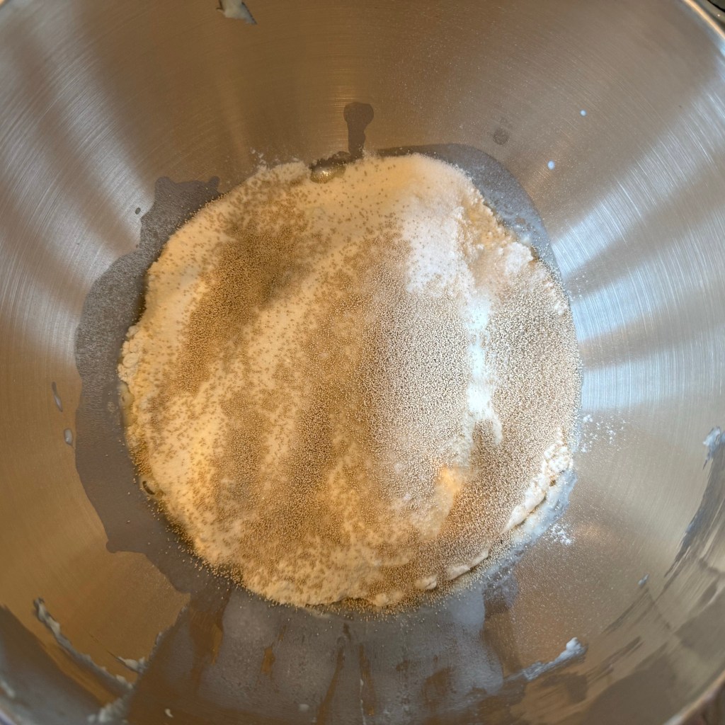 I mixed the ingredients together on my KitchenAid mixer on the “stir” setting for 3 minutes, then on speed 4 for 5 minutes, then set the dough aside to rest.