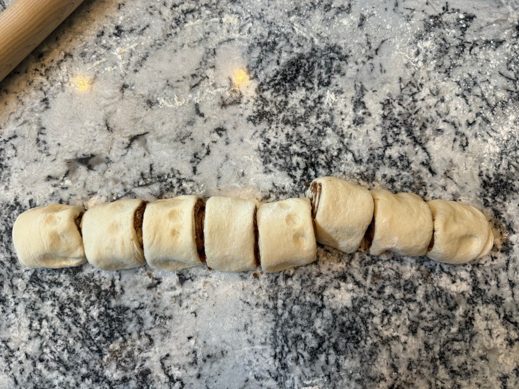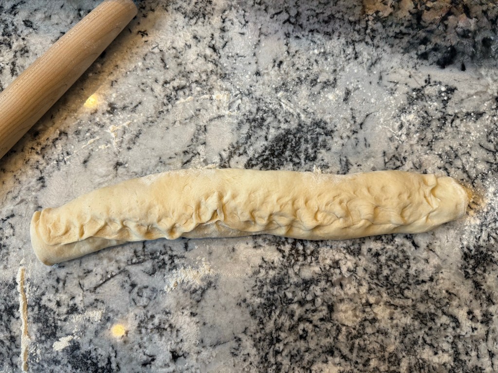 After an hour the dough had risen, so I divided it into 12 pieces and roughly preshaped each piece into a log.