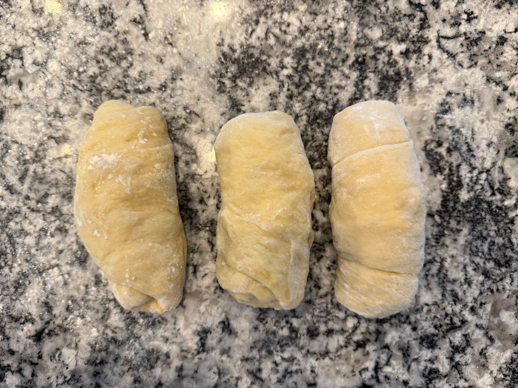 Once the bulk fermentation was complete I divided the dough in half and pre-shaped it. One half was further divided into three logs for a braid. The other half stayed in one piece.