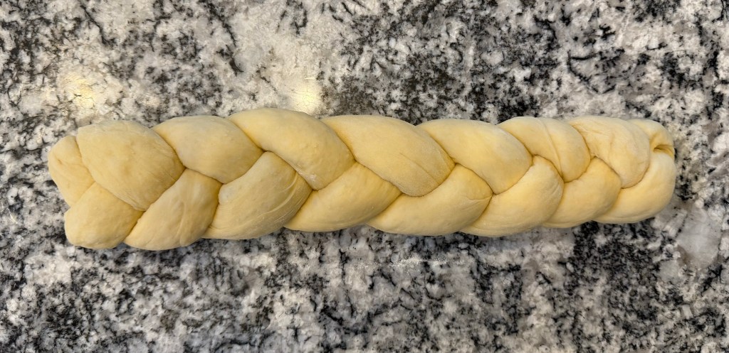 Once the dough had rested for 15 minutes I shaped it. The three logs were rolled out very long and thin and braided. I learned that rolling dough into a thin log works best when you only roll one direction (toward your body or away from your body) instead of rolling back and forth (toward and away from your body).