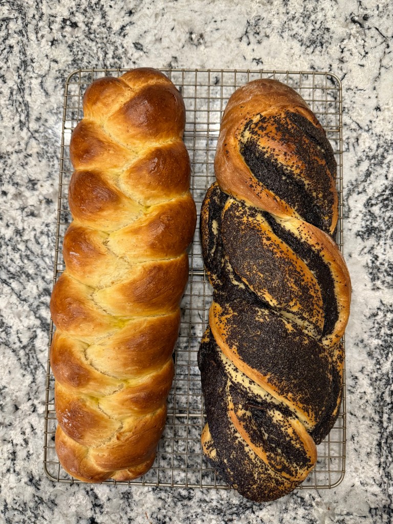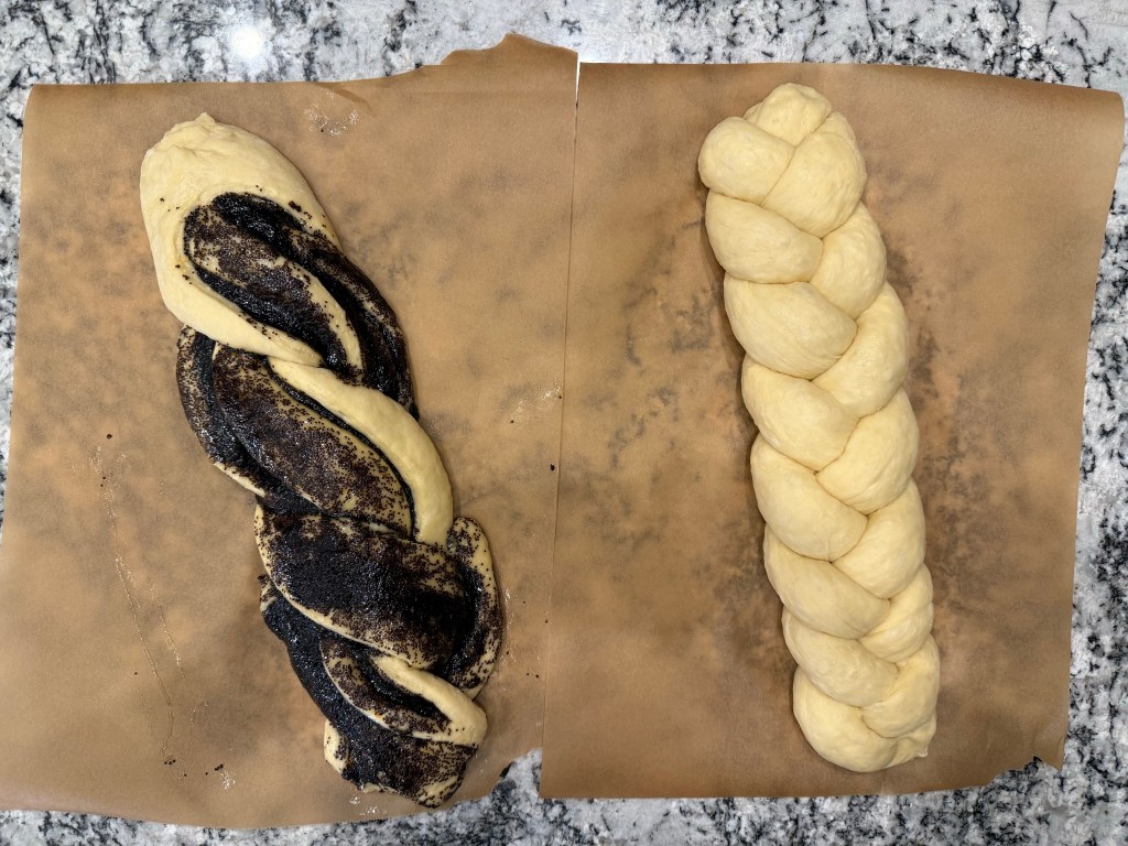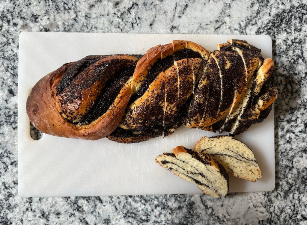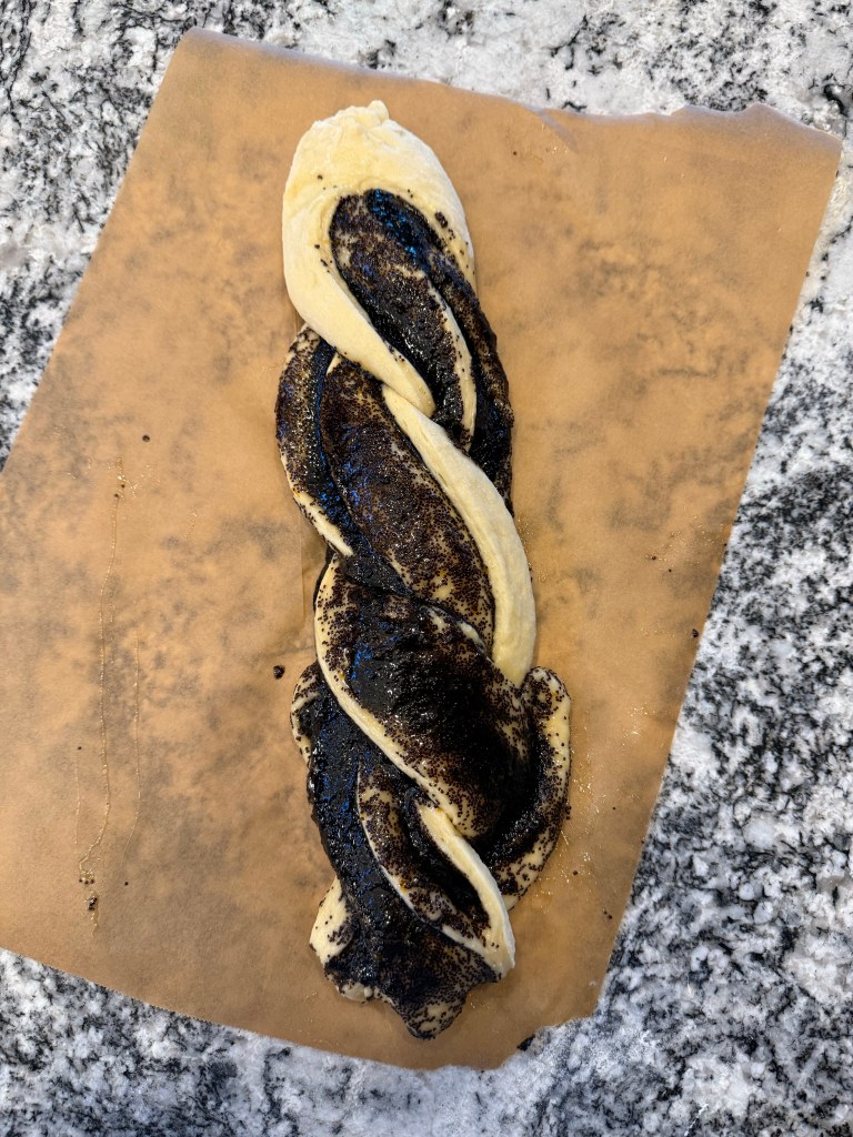 The other half of the dough was rolled out into a large rectangle (yay! I got to use my rolling pin!), spread with poppy seed filling, then rolled up like a cinnamon roll. Finally, I used a bread knife to cut the roll down the center and twisted the two halves together decoratively.