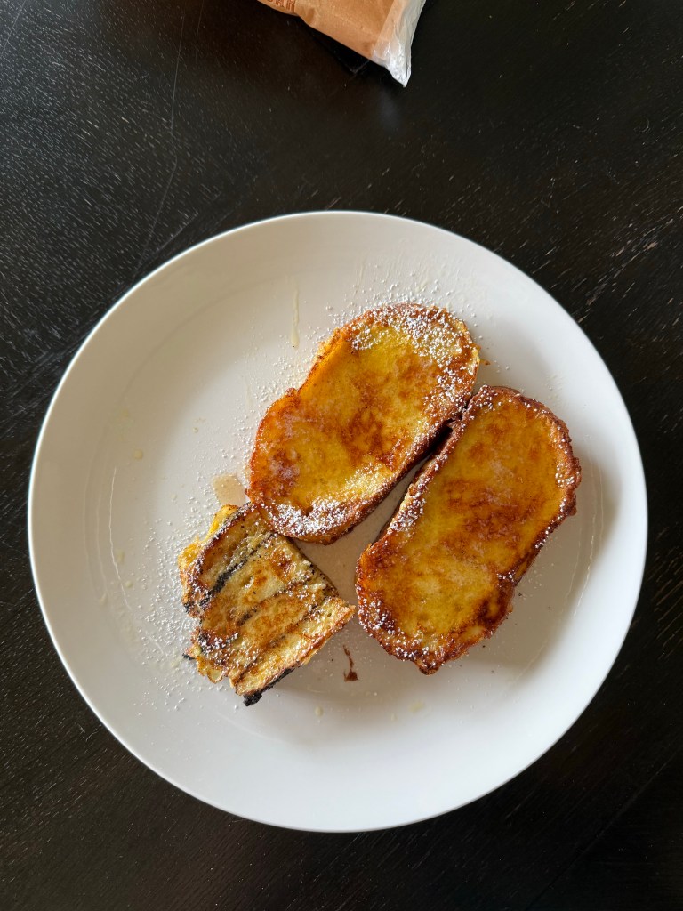 We tried French Toast with both the plain bread and the poppy seed bread. The orange zest in the poppy seed bread was a bit strong for us in this application. Frankly, the orange zest was a bit much in the poppy seed bread for me overall. Lemon zest would have been better here. My husband made a lemon frosting to eat with this, which was divine.