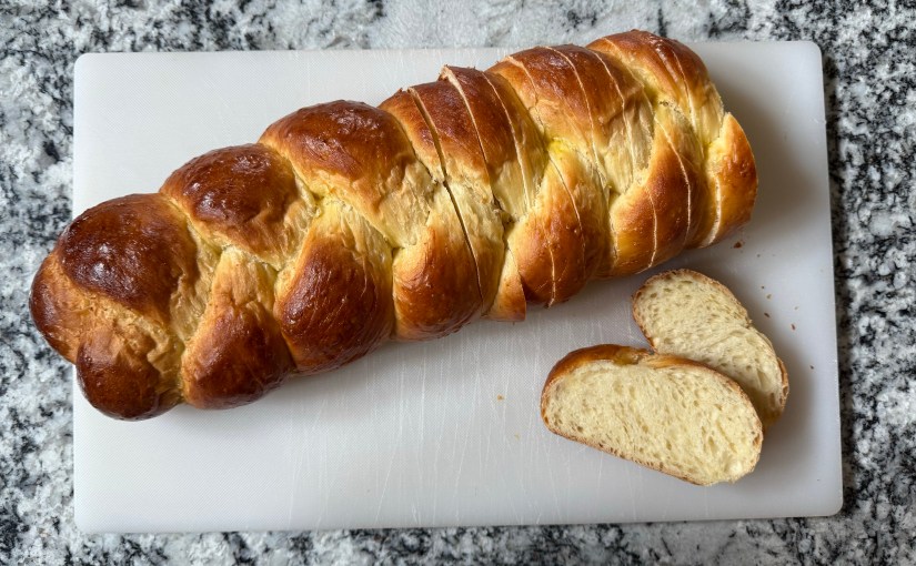 Once the dough had rested for 15 minutes I shaped it. The three logs were rolled out very long and thin and braided. I learned that rolling dough into a thin log works best when you only roll one direction (toward your body or away from your body) instead of rolling back and forth (toward and away from your body).
