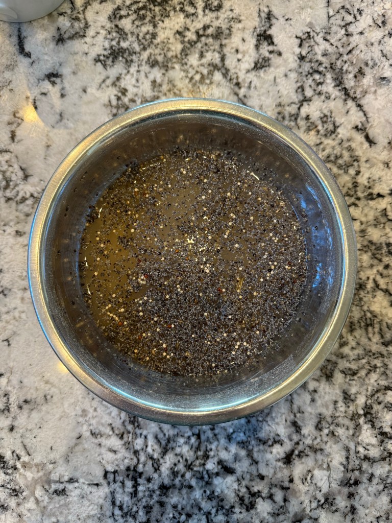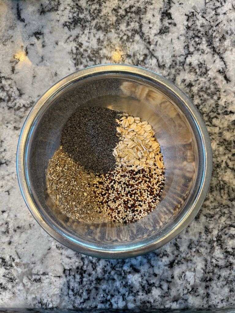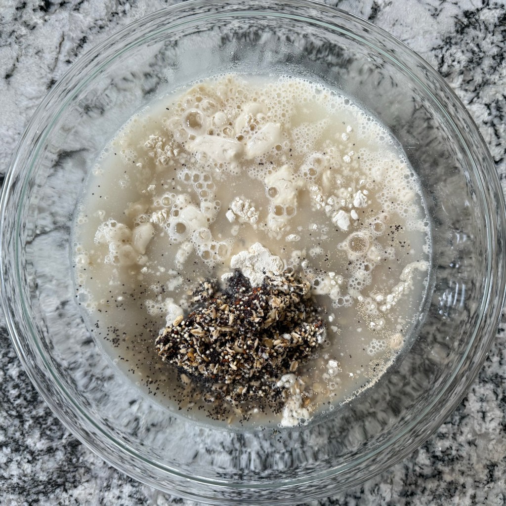 The night before baking I weighed out my grains and seeds and set them to soak. I used 20 grams each of poppy seeds, quinoa, and Old Fashioned oats, and 25 grams of rye grain (I used my grain mill on the largest setting to crack the grain).