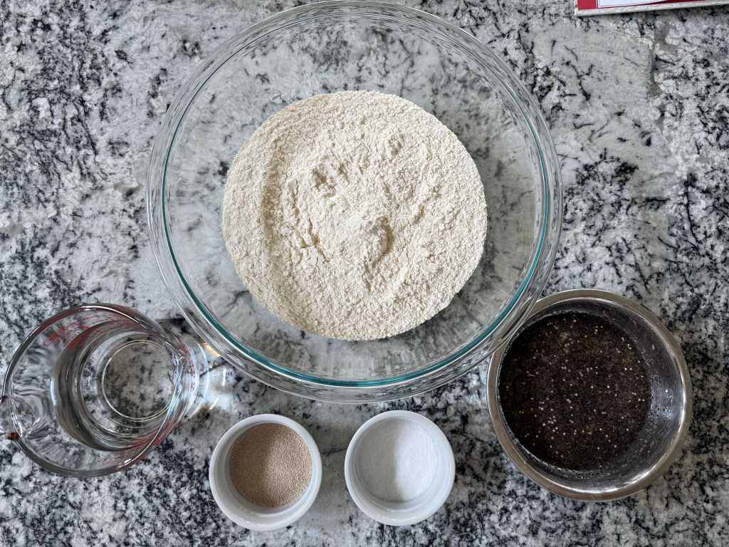 The next morning I prepared my mise en place. Other than the soaked grains, this bread is extremely simple: just flour, water, salt, and yeast.