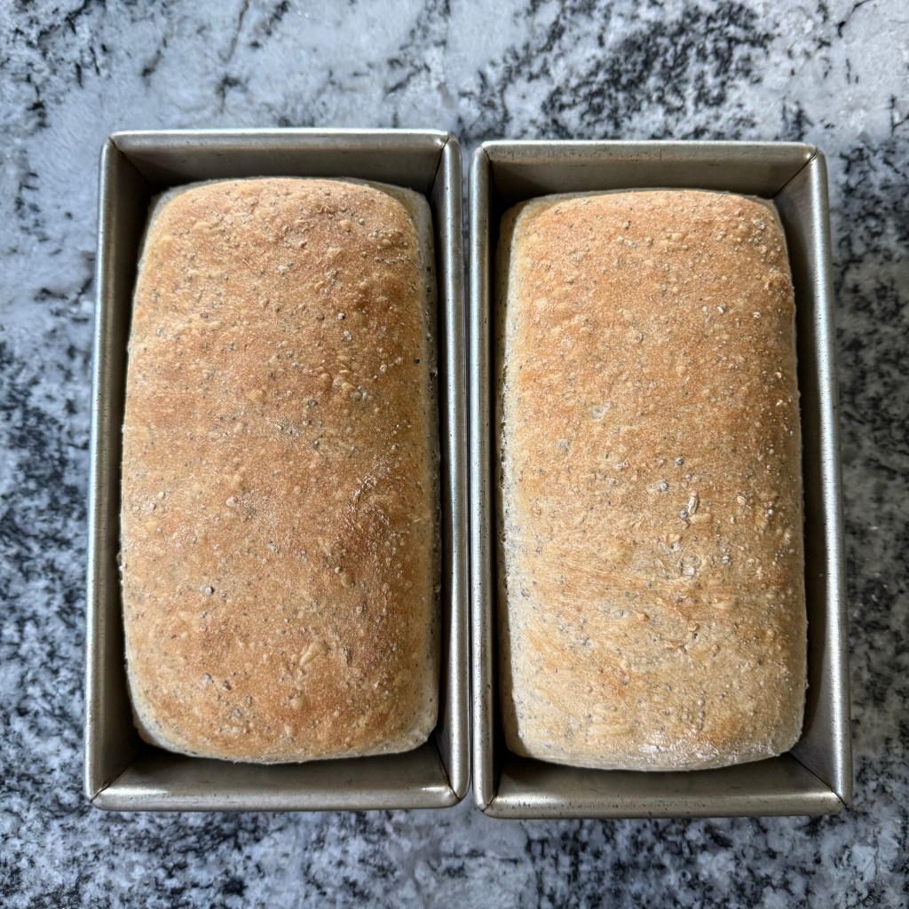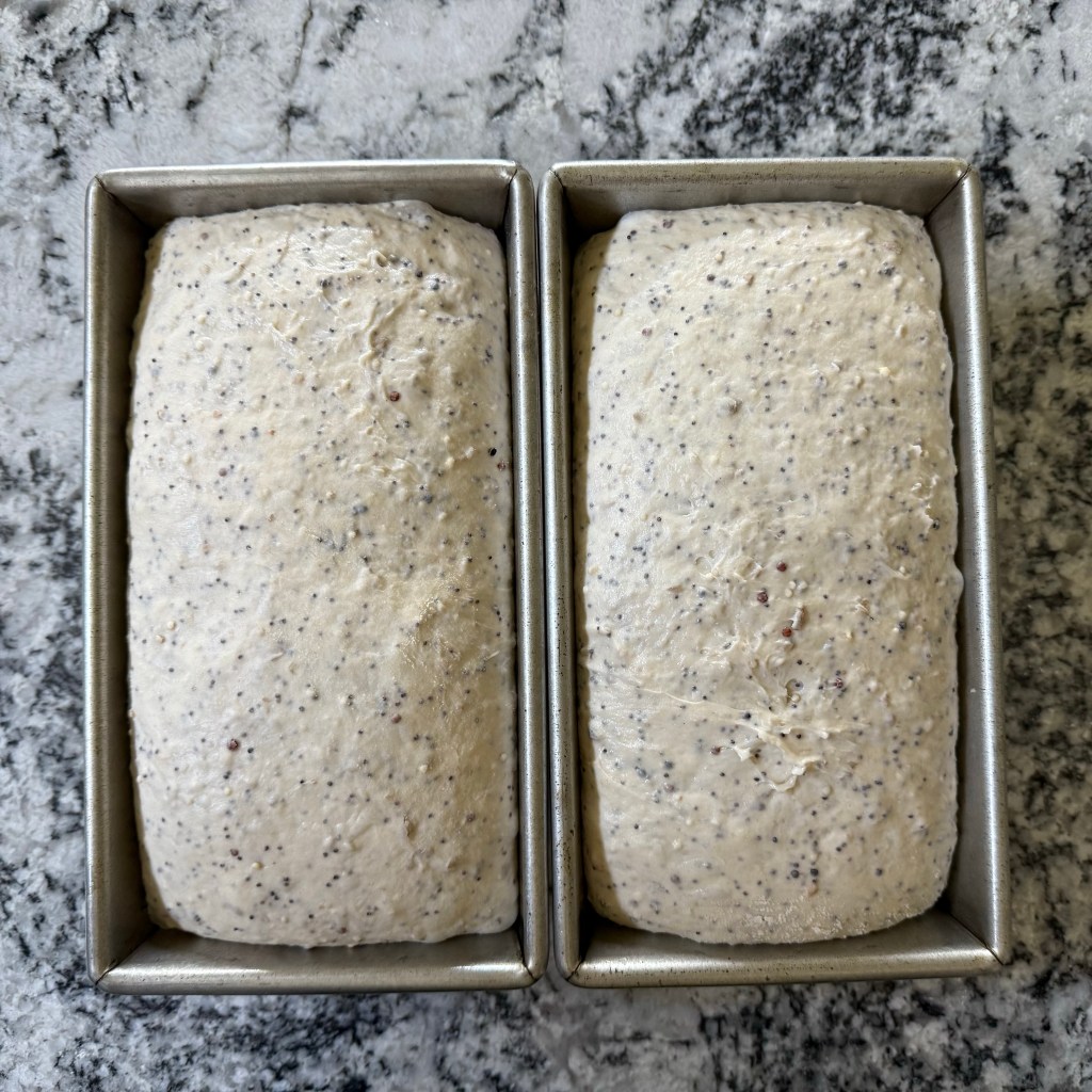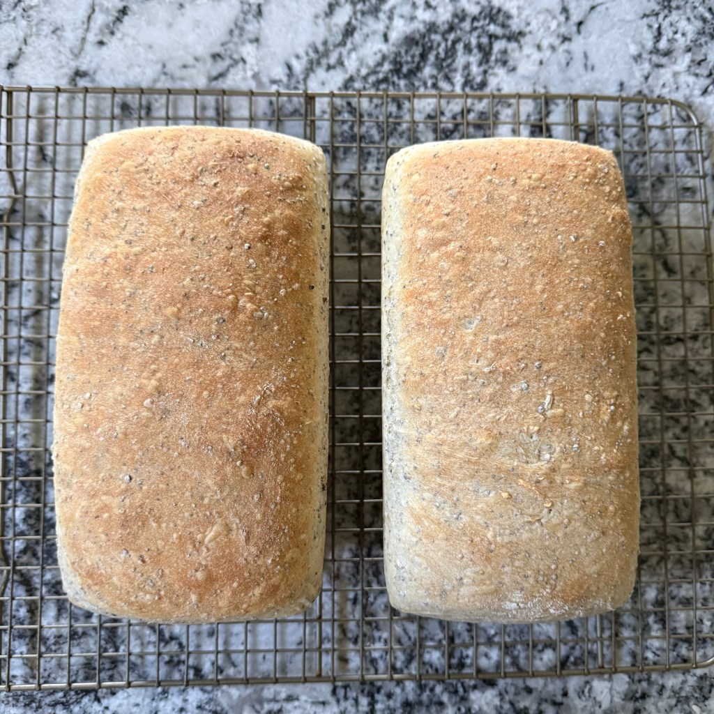 Words are funny. When I picture a “multigrain” bread I think of something brown, made with whole wheat flour. This loaf, however, is made entirely of white bread flour, but incorporates whole grains and seeds. Surprise!