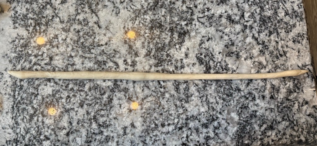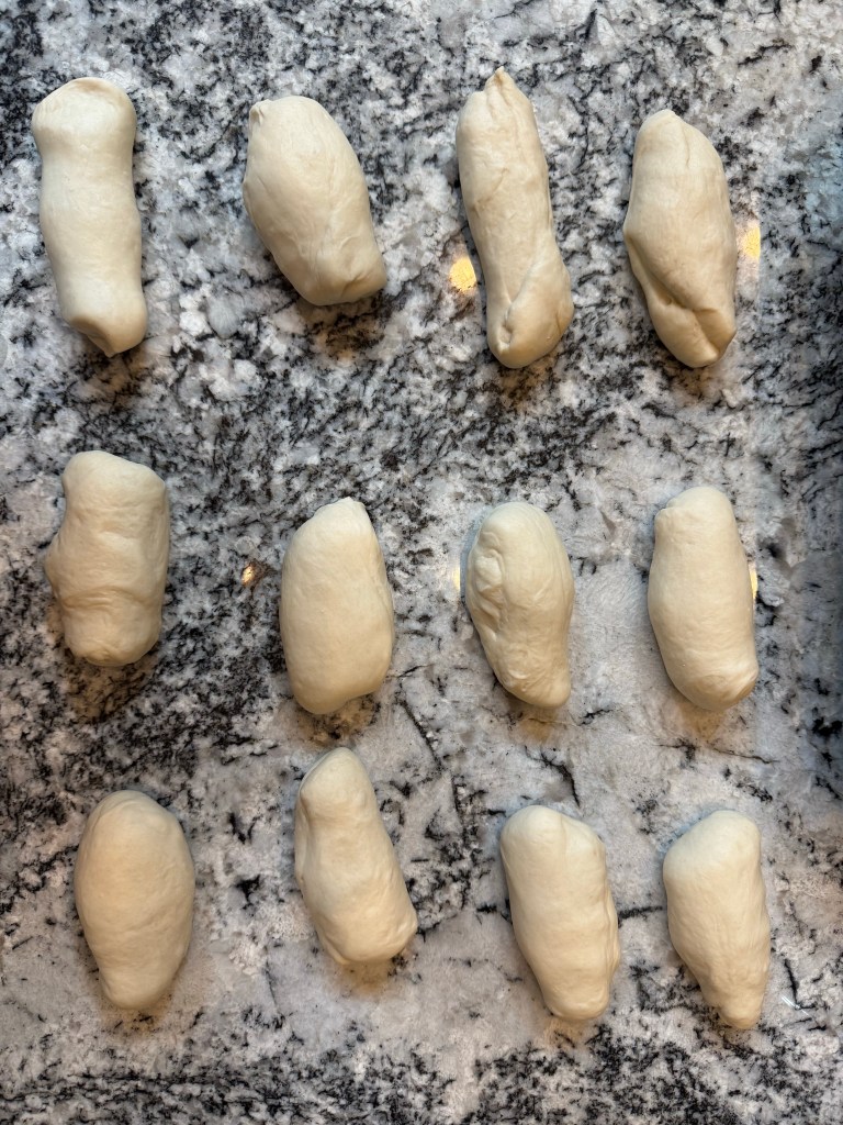 After an hour the dough had risen, so I divided it into 12 pieces and roughly preshaped each piece into a log.