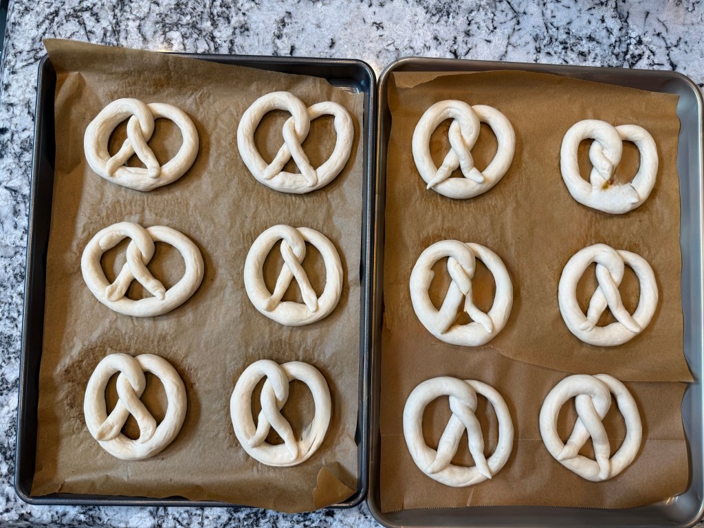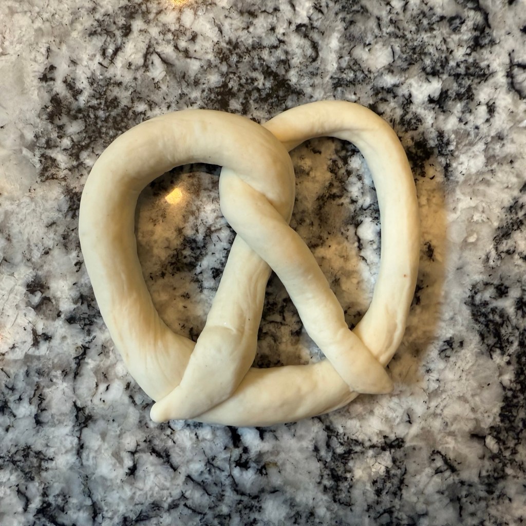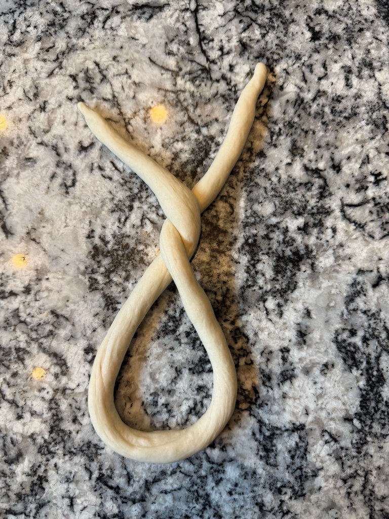 Then I shaped each piece into a pretzel. First I rolled each log into a long snake, about 2 feet long. Then I twisted the ends around each other twice. I brought the ends down to the base of the pretzel body and smushed them into place. Finally, I shimmied the pretzels into a nice shape and placed them on a pan to rise.