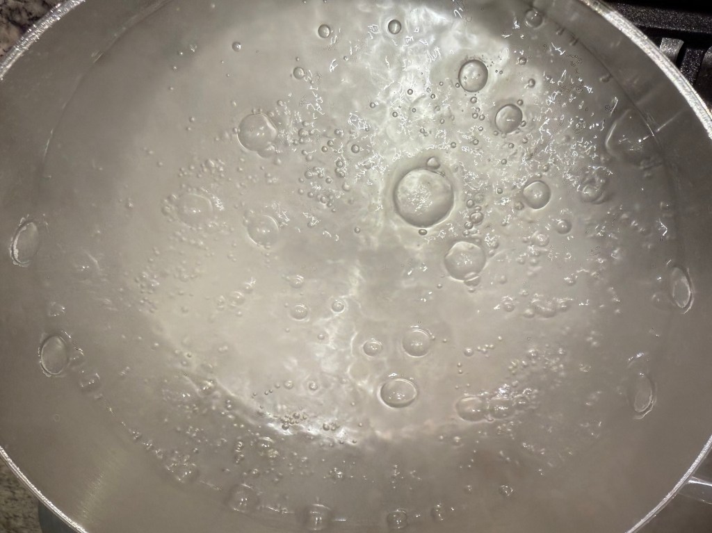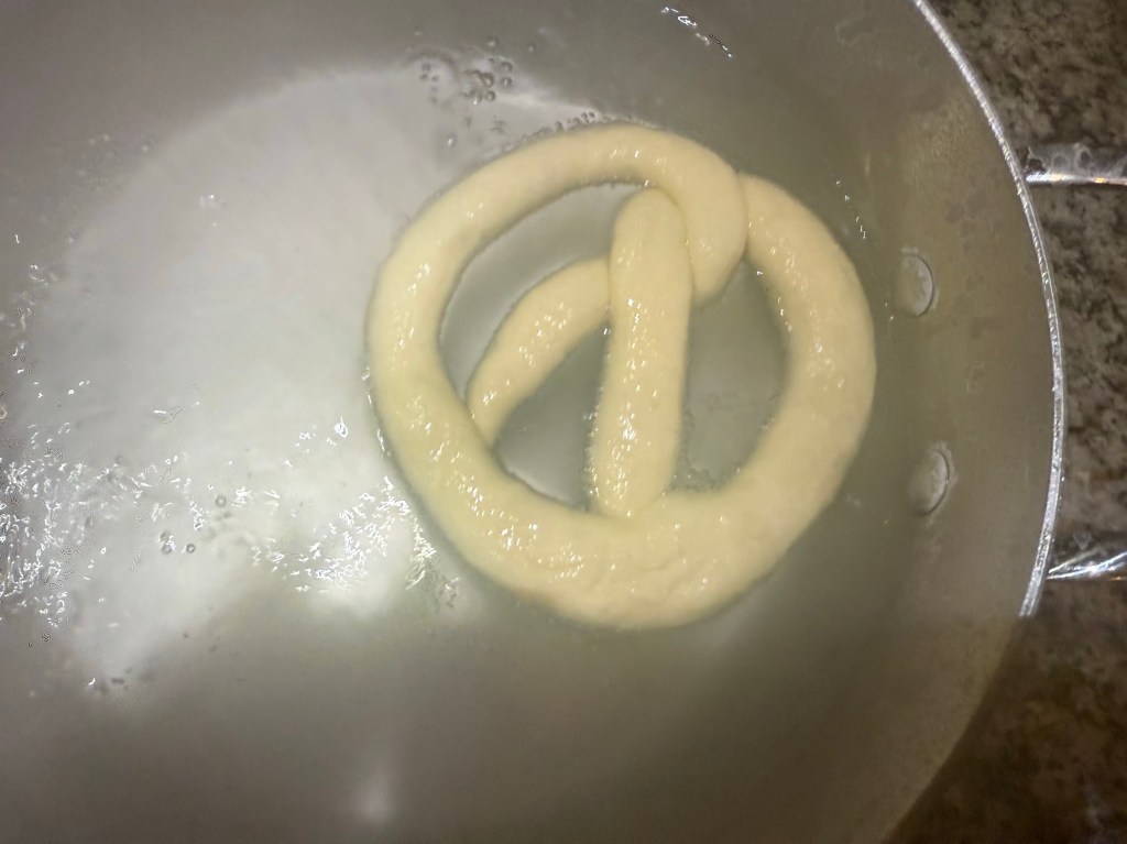 I boiled each pretzel individually for 10 seconds on each side. It was a little tricky to get the pretzels into the water without deflating them, distorting the shape, or sticking to them.