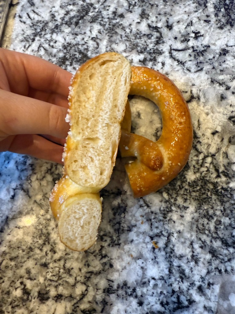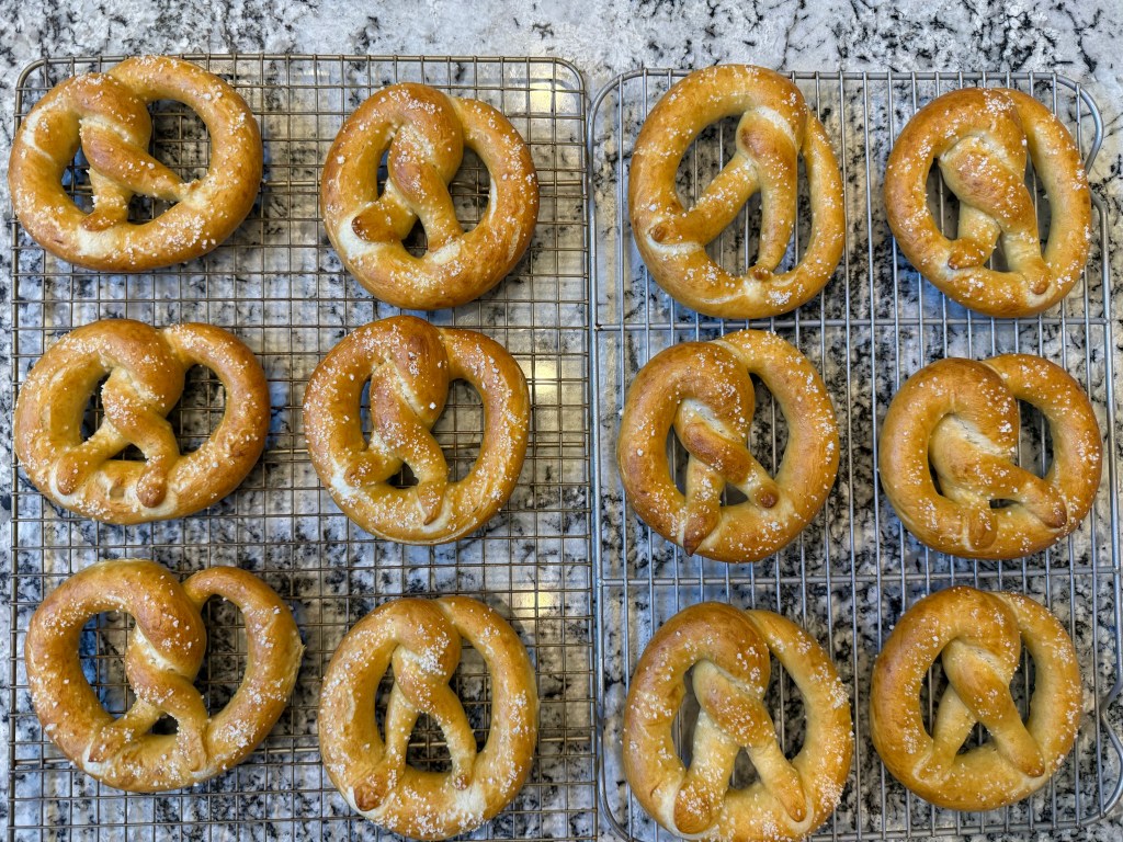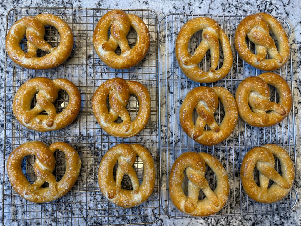 I baked the pretzels for 22 minutes, which was the maximum recommended baking time. I rotated the baking pans throughout the bake to get even colour on the pretzels. The pretzels baked to a deep golden colour, as specified in the directions, but not to a darker brown as shown in the picture and as is typically seen on pretzels.
