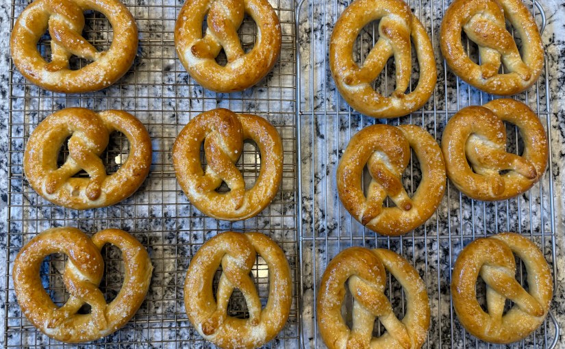 The pretzels are delicious. They have a buttery flavor (not surprising, since they were brushed with butter after baking). They taste pretzelly, but not super pretzelly. Commercial pretzel bakers boil the pretzels in a lye solution, which is more caustic than the baking soda solution I used. This impacts both the flavor and the colour of the pretzels. I have read that you can bake baking soda to change it into Carbonate of Soda (rather than Bicarbonate of Soda), which is more caustic than baking soda, but less caustic than lye, so I’d like to try either that or a lye bath next time. I also wonder how much deeper the colour would have gotten if I had left the pretzels in the oven for 25 minutes. Would they have been over-baked at that point? Clearly more experimentation is needed.