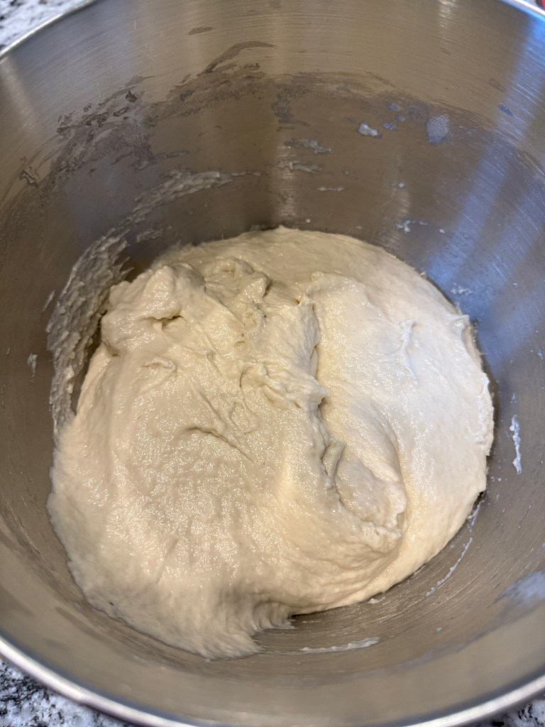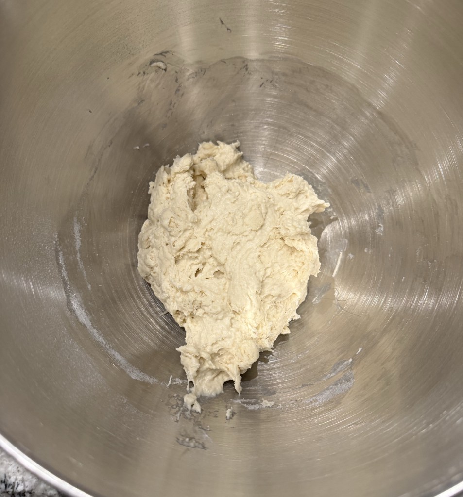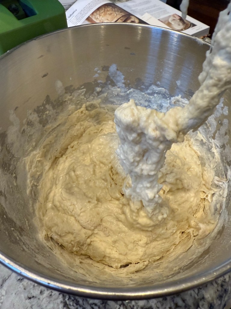 After 15 minutes of rest I began kneading the dough using the chop, slap, and fold method as outlined on pages 54 and 55 of the book. I’ve never used the slap and fold method kneading before, but I quite liked it.