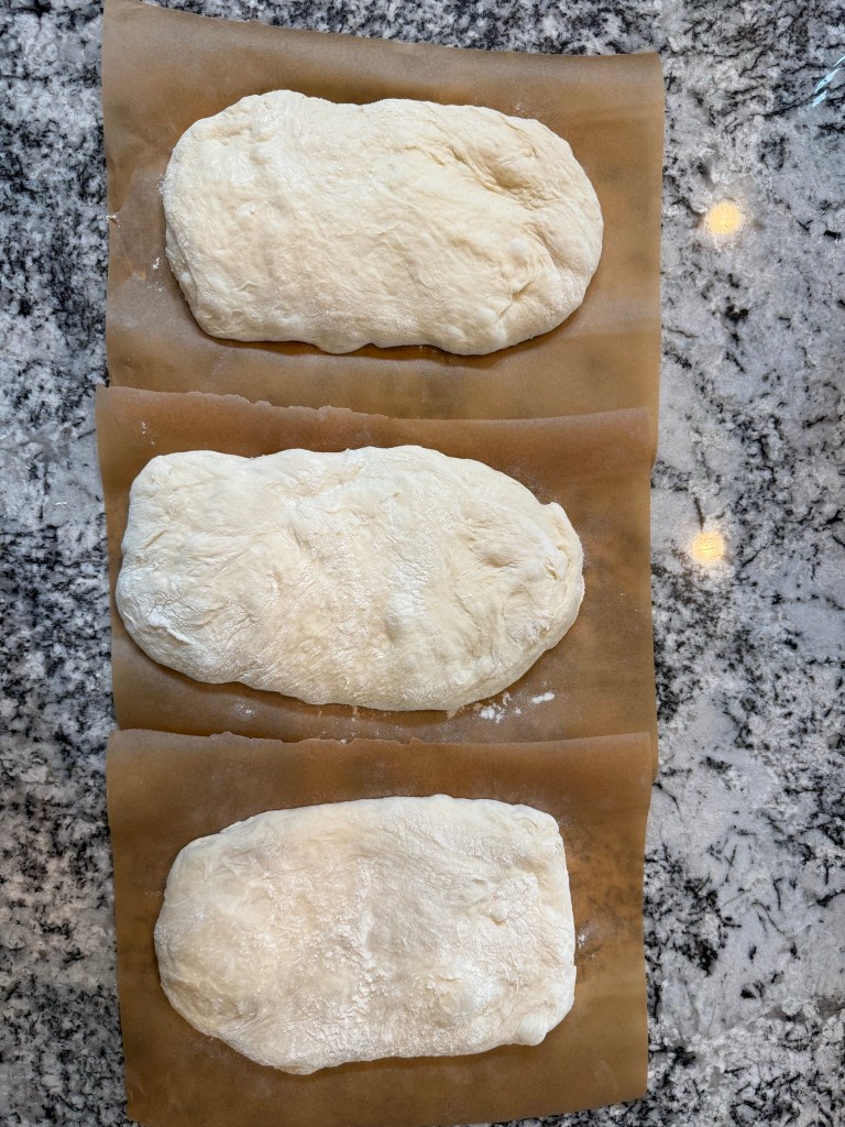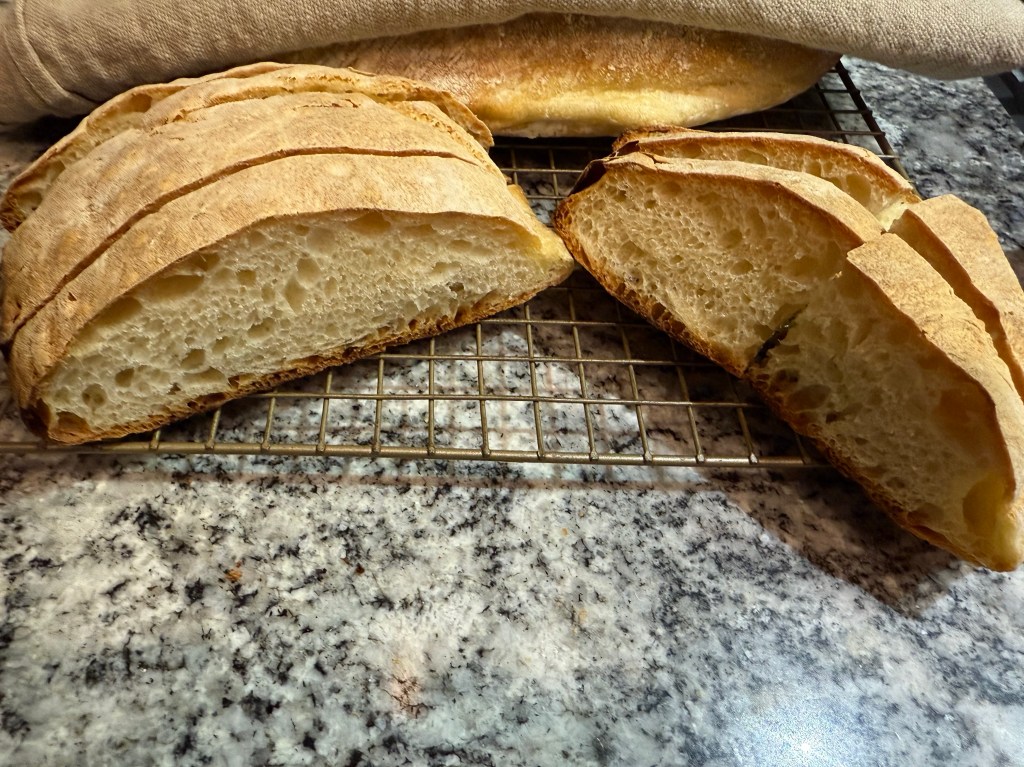 The biga was ready 11 or 12 hours later, but since the yeast gives one a window of several hours before it expends all its food and starts to deflate, I waited until a convenient time for me to start baking, which was about 15 hours after mixing.