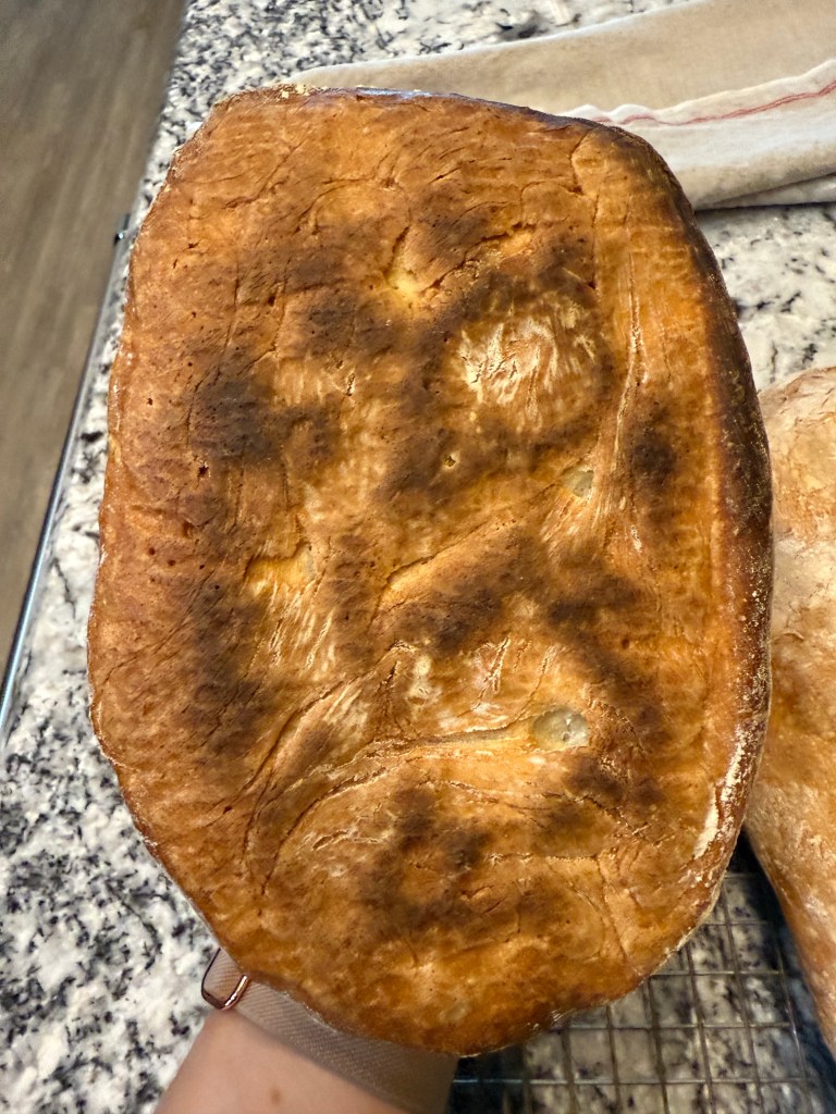 I meant to turn the oven down to 400 degrees Fahrenheit when I removed the lid, but I forgot, so I turned the oven down 10 minutes later. The bread stayed in the oven for another 30 minutes, for a total bake time of 55 minutes.