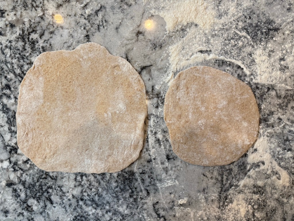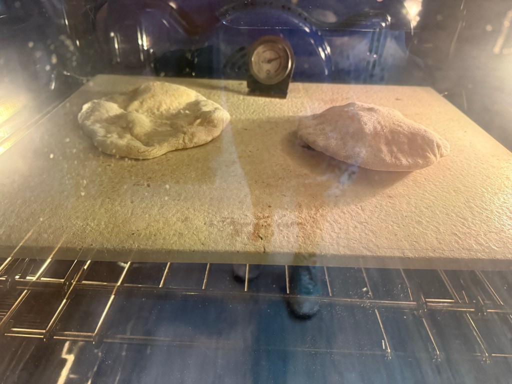 The balls rested for 15 minutes while the oven finished preheating, then I rolled them out into rounds. The spelt flour is very extensible, and I rolled the first two pita much too thin, but the last 6 were a reasonable size and thickness.