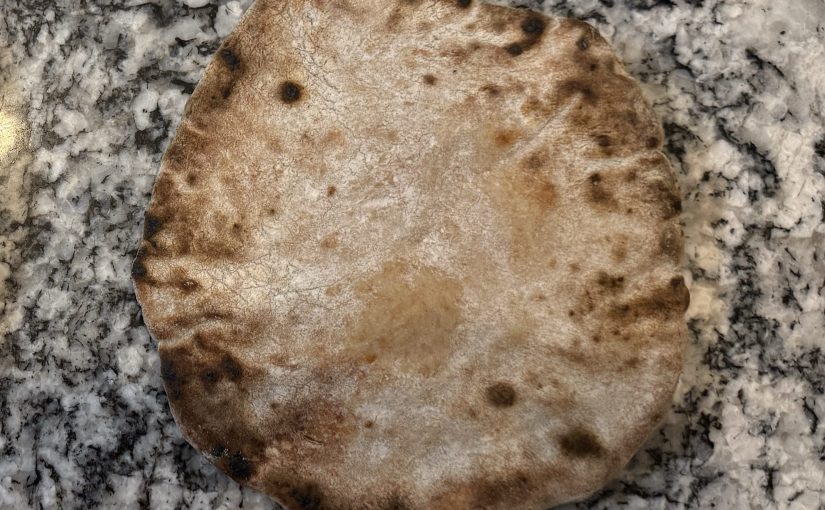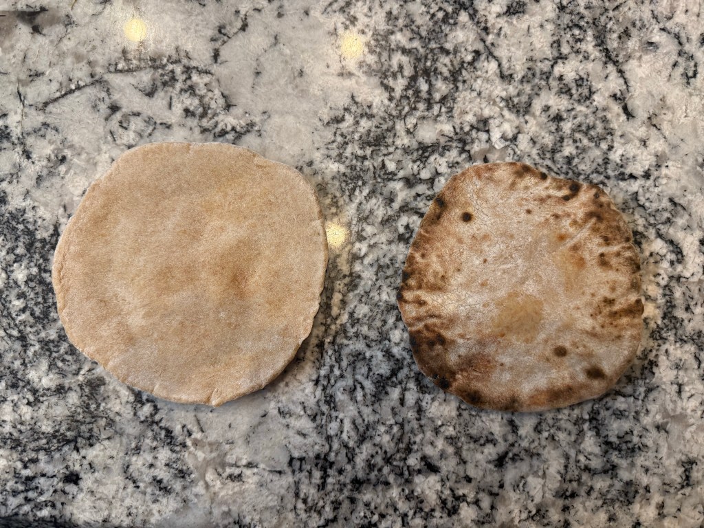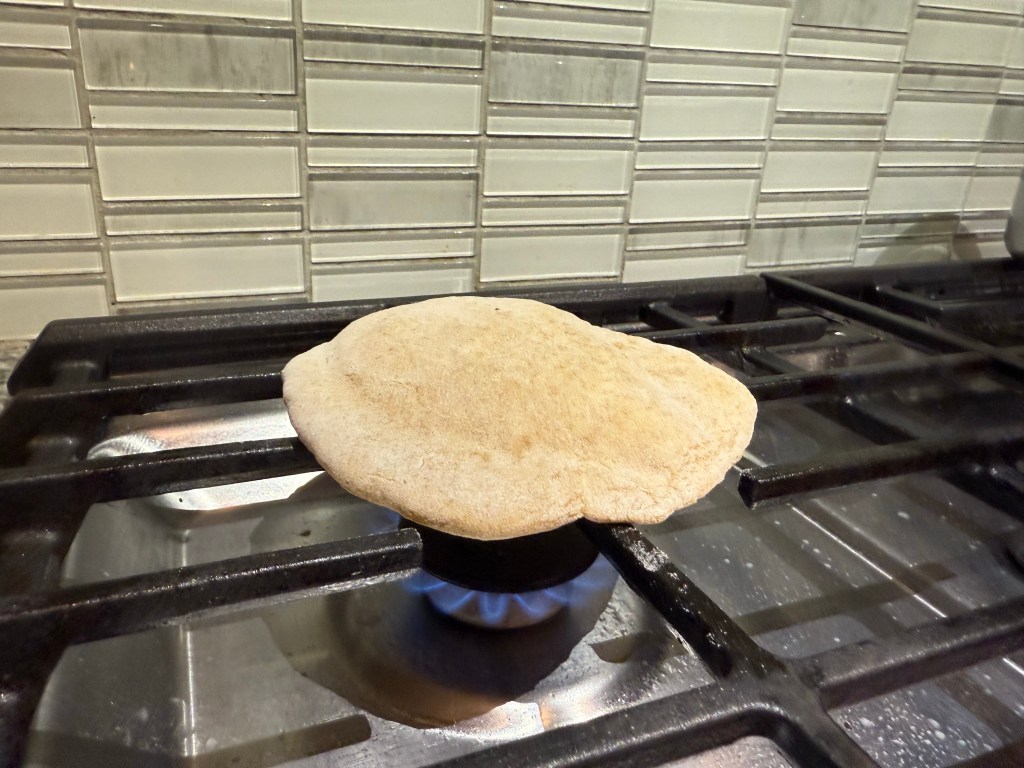 The finished pita were quite blonde. Since colour = flavor, I chose to cook the pita over my gas stove for a few seconds before serving. This helped both the flavor and texture of the pita.
