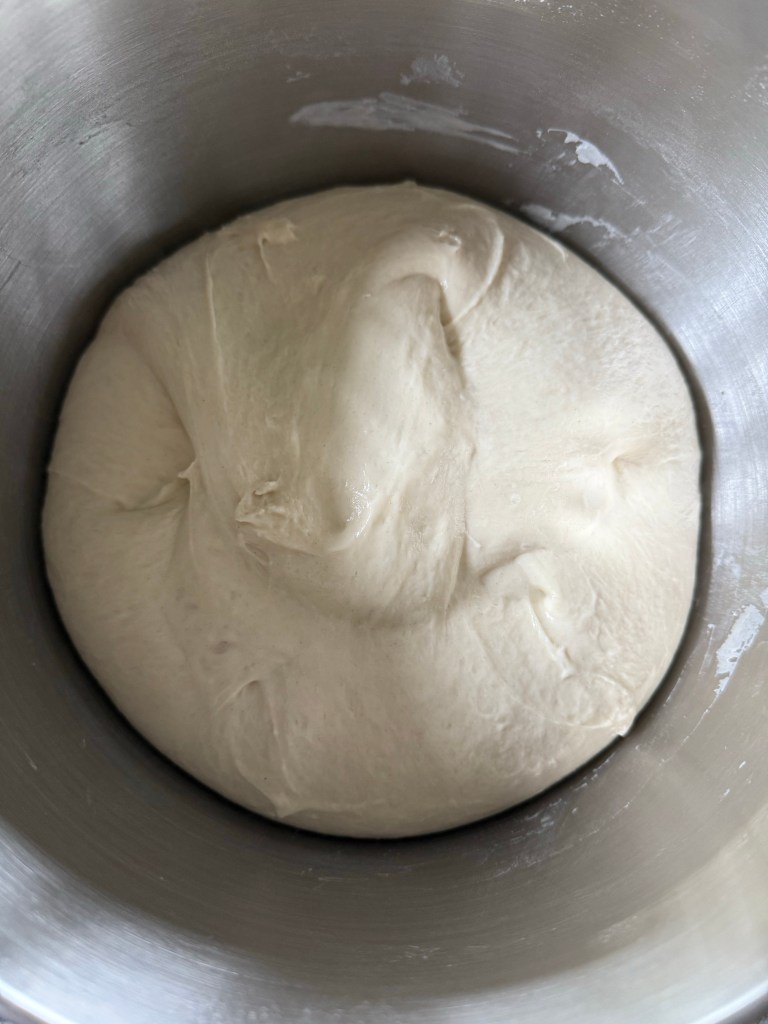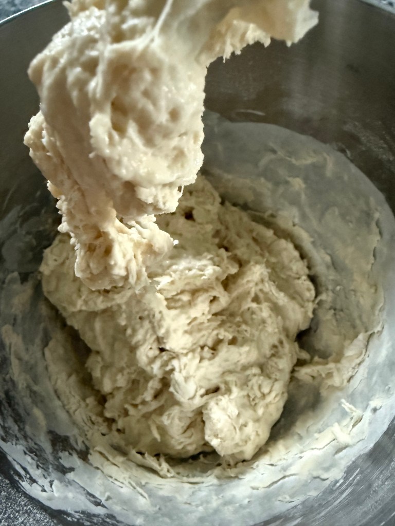 14 hours later I mixed the dough in my KitchenAid mixer. I dislike the feeling of a very sticky dough on my hands, so I prefer to use tools to mitigate the stickiness. After the initial mix I kneaded the dough in the mixer for a few minutes, then covered it and set it aside to rise.