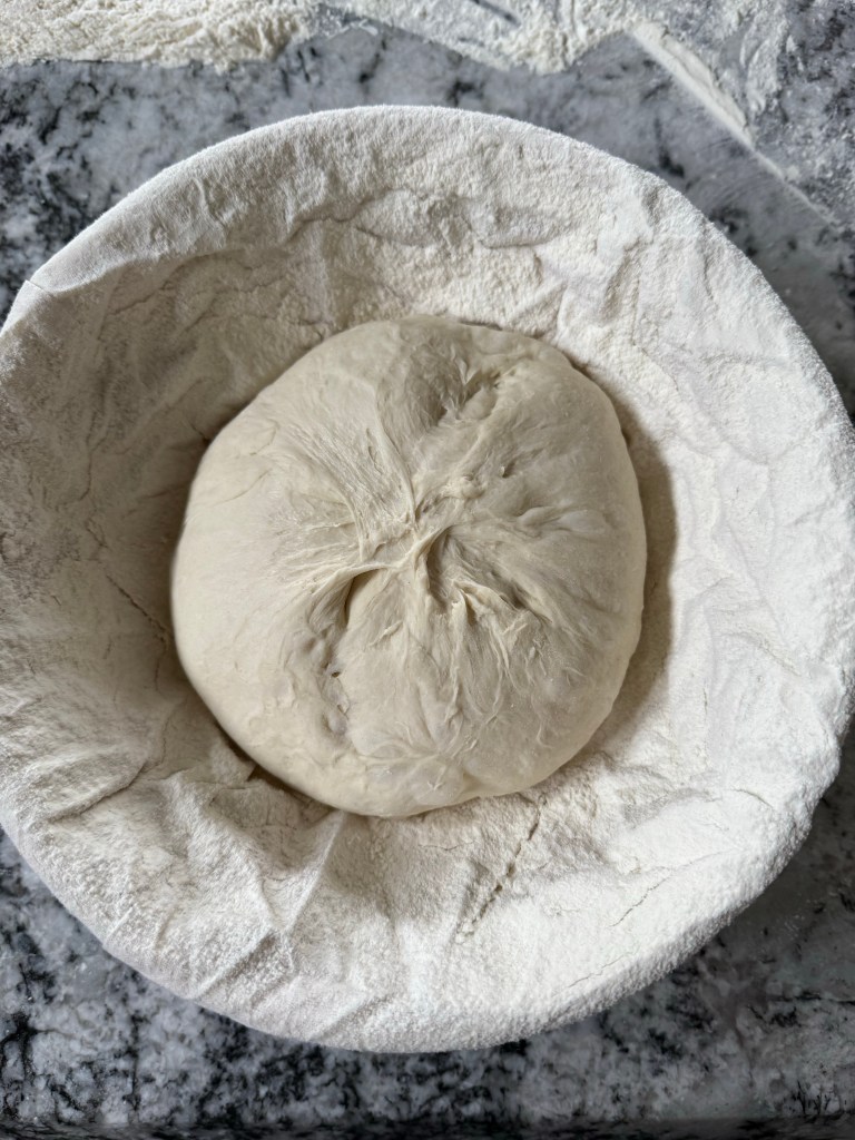 While the preshaped dough rested I floured my bannetons. After 20 minutes I did the final shaping, put the dough in the bannetons (seam-side up), and covered them for the final rise. I also started my oven and my baking vessels preheating.