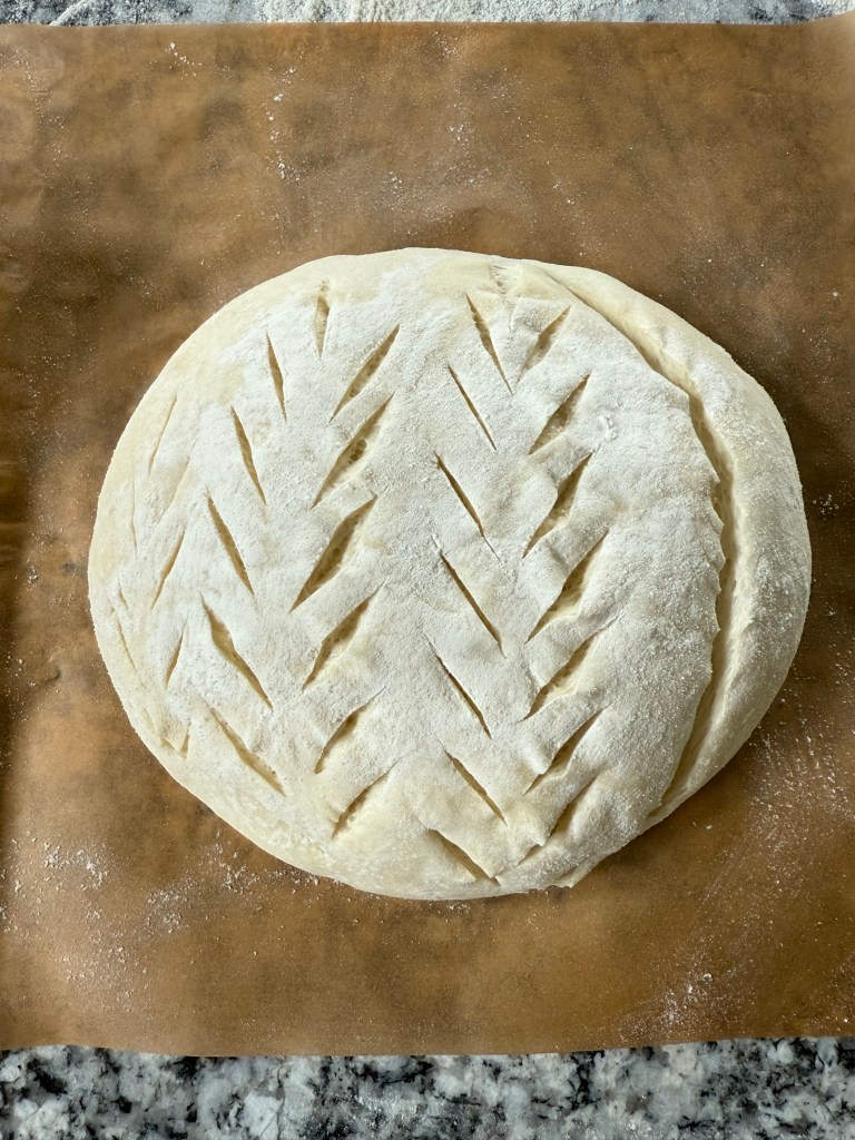 After the final rise was complete I turned the dough out of the bannetons onto parchment paper. I brushed away the excess flour, and scored the dough before putting the dough into my baking vessels and into the oven.