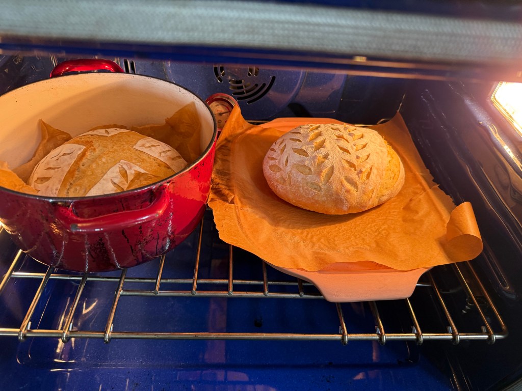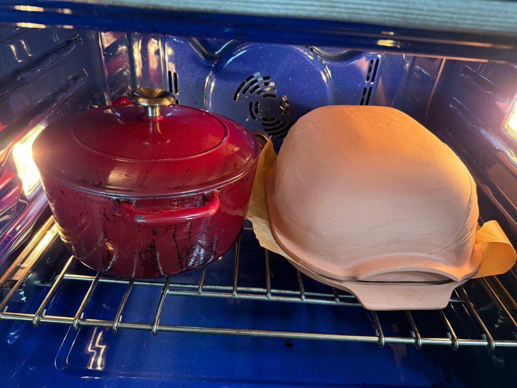 I kept the lids on the baking vessels for 15 minutes to allow the dough to bake with steam. I removed the covers and lowered the oven temperature after 15 minutes.