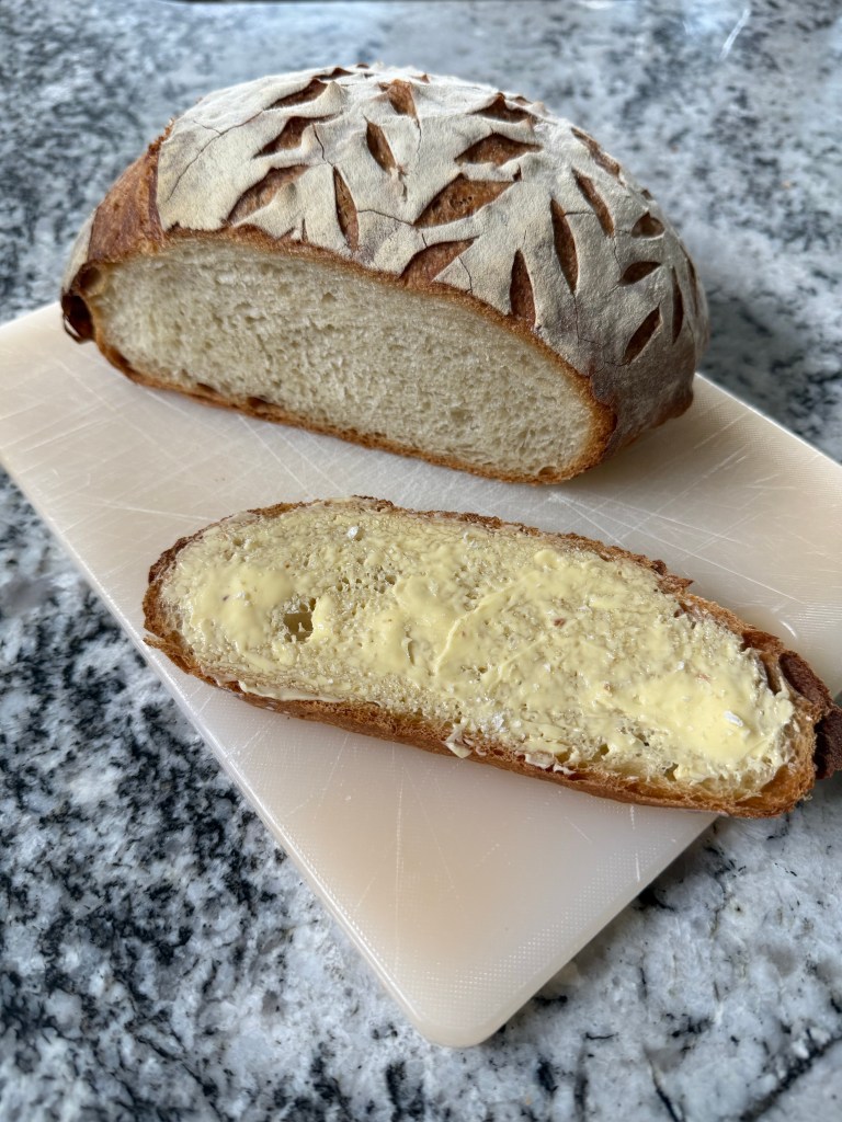 First of all, this bread is pretty. I love how scoring can be decorative as well as functional. Secondly, this bread is delicious. It has a tight crumb with few large holes. It tastes almost like a sandwich bread, except for the thicker, tougher crust. I love a crusty bread. This bread does feel more sophisticated or refined, or maybe less rustic than similar breads made with less yeast and more time.