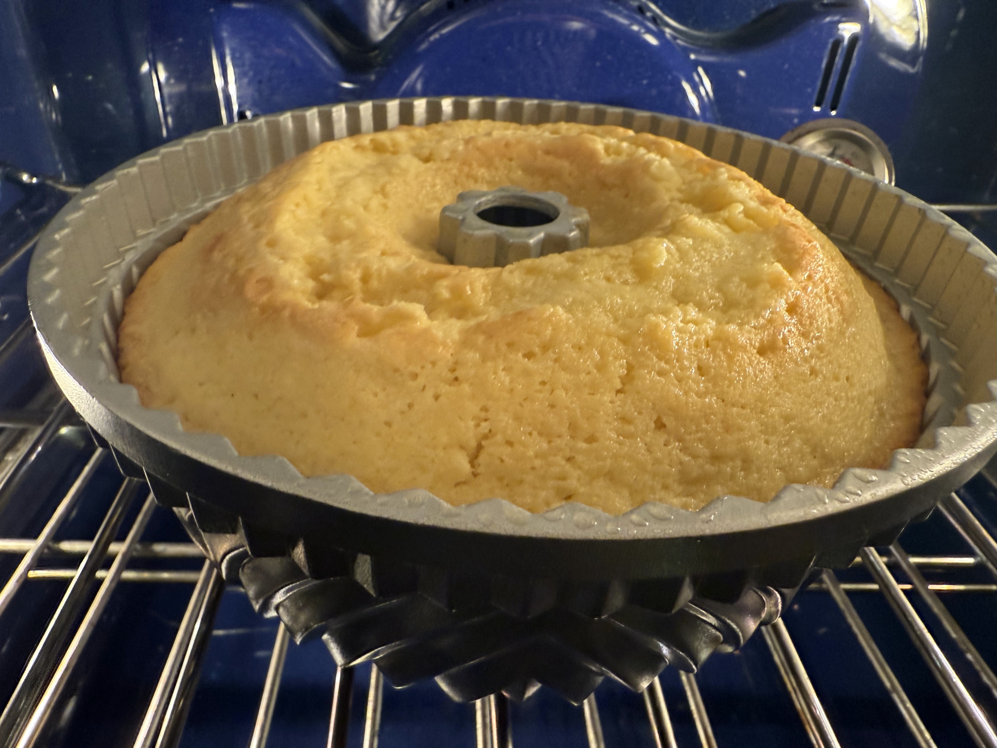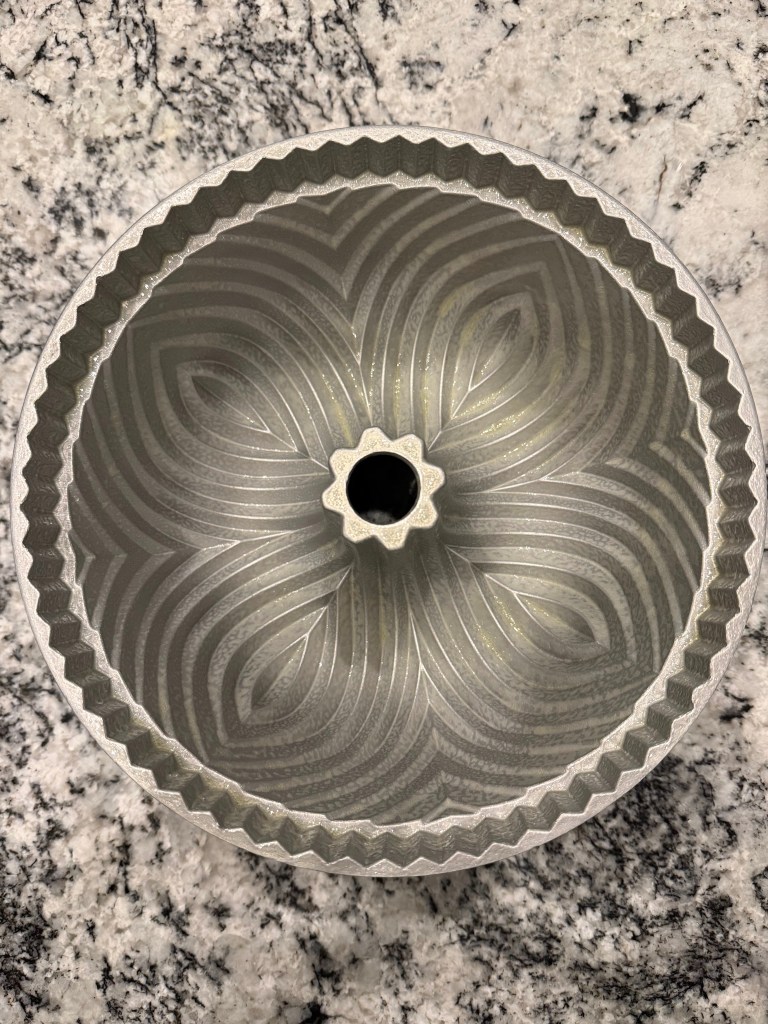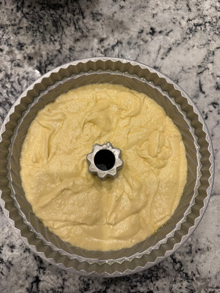 With my batter ready to bake, I prepared my bundt pan. Normally I would prepare the pan before mixing my batter. I typically use the classic method of generously buttering the pan with a pastry brush and then flouring the pan, but the book suggested that I could merely spray the pan with oil liberally just before scooping the batter in and all would be well. I was skeptical, but I’ll try anything once.