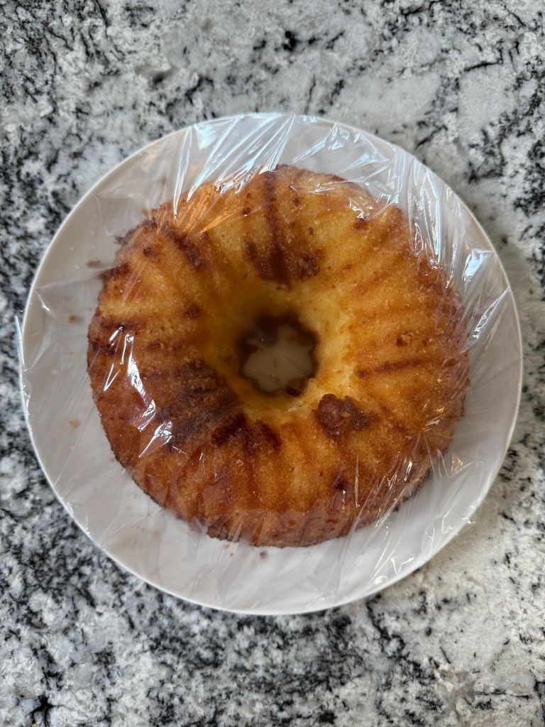 Before plating the cake I cut off the domed portion to help it sit flat on the plate. I drizzled the glaze over the cake, then wrapped the whole thing up to take to a meetup with some friends.