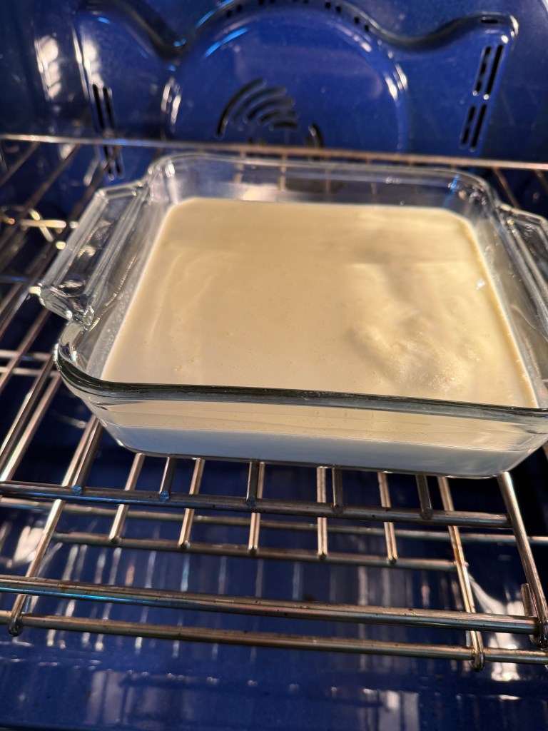 I allowed the cream to cool overnight, then poured off the whey. The golden bits on the top were rather crunchy, and that wasn’t the texture I was going for, so I strained the remaining cream through a sieve before serving.