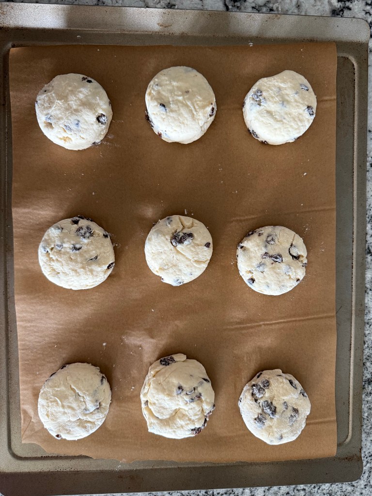 At this point I departed from the recipe. Instead of shaping the dough into one large round and cutting it into 8 wedges, I cut out 9 rounds.