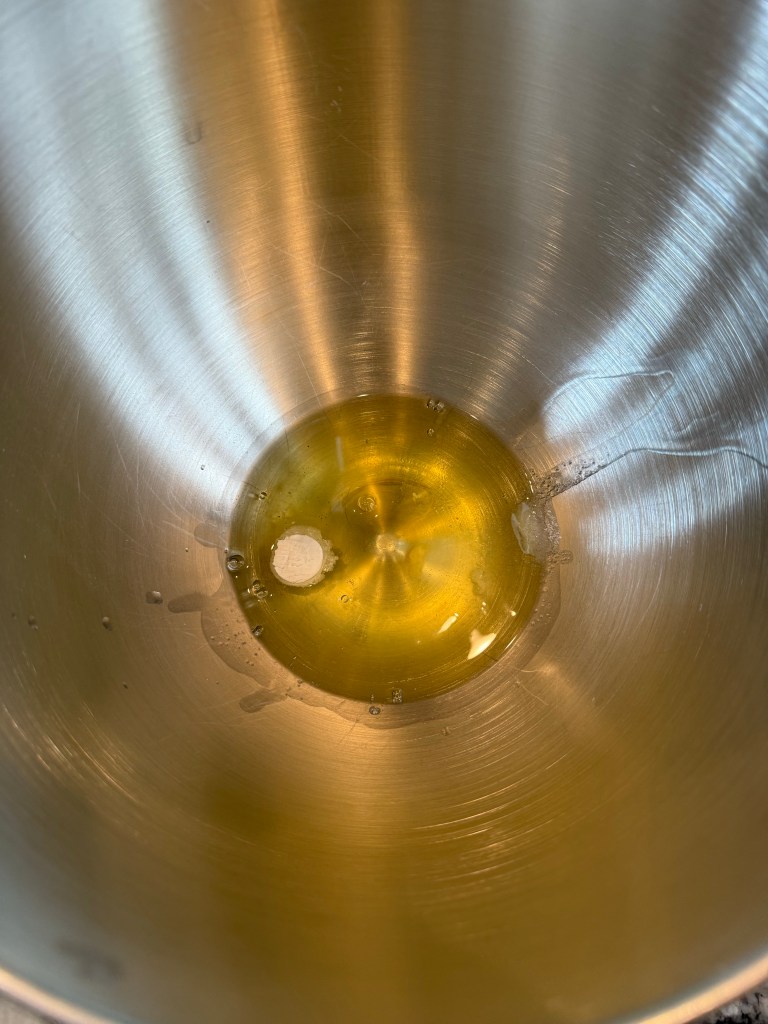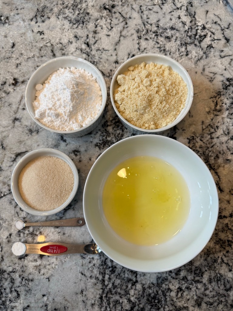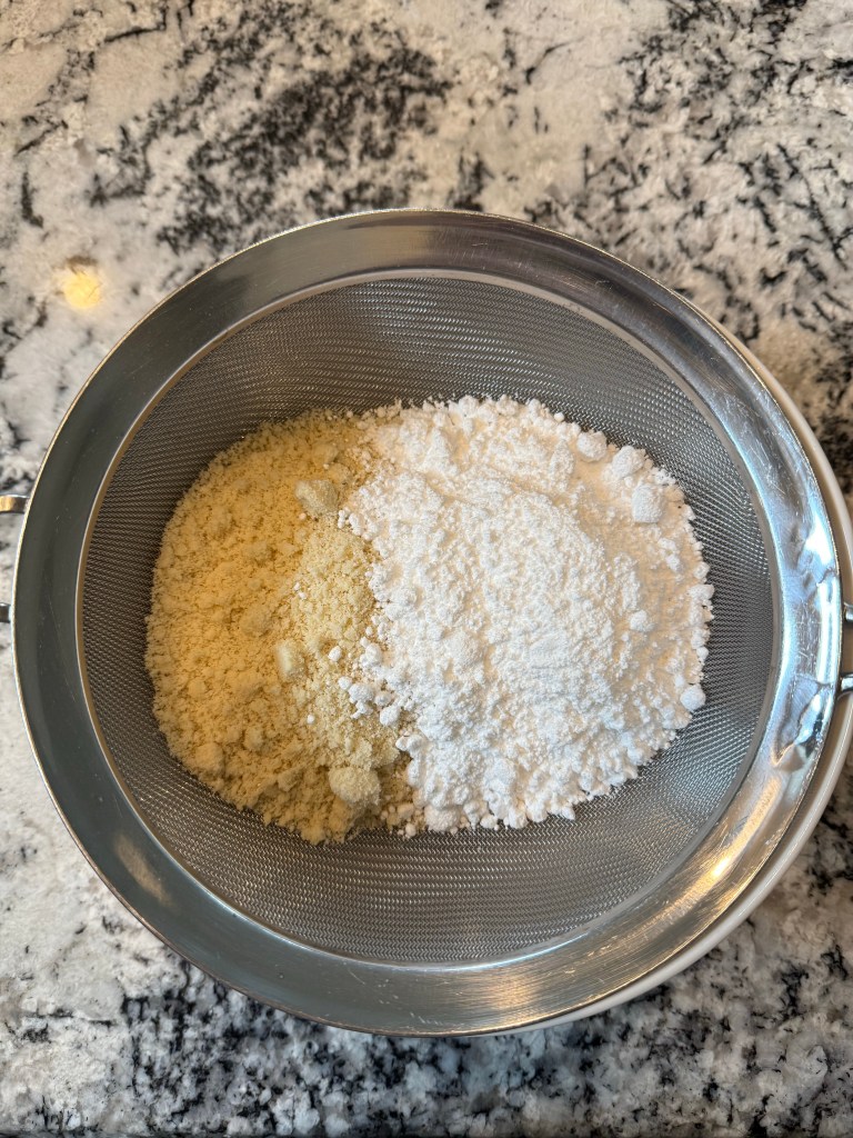I combined the almond flour and powdered sugar in a sieve over a bowl and sifted them together. Almond flour is quite a bit more course than most wheat flour, so this process takes some time and effort. It’s important to work as much of the almond flour through the sieve as possible so the ratios of the recipe don’t become skewed.