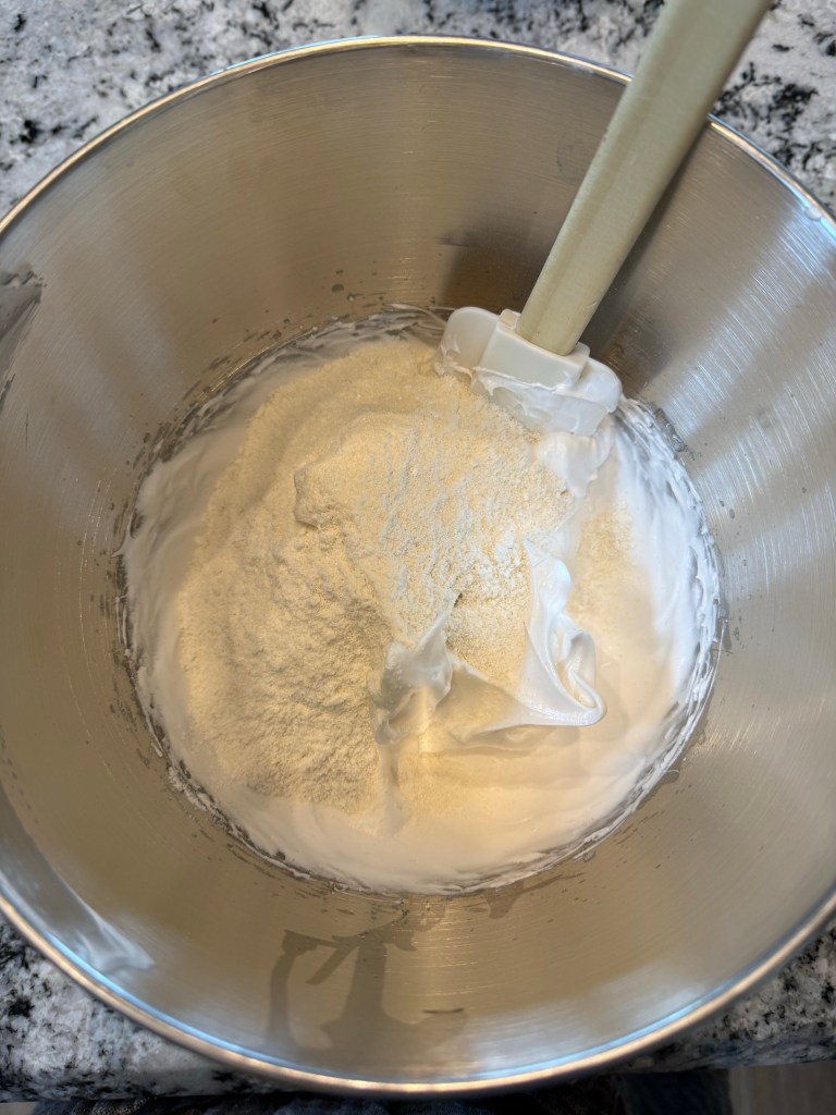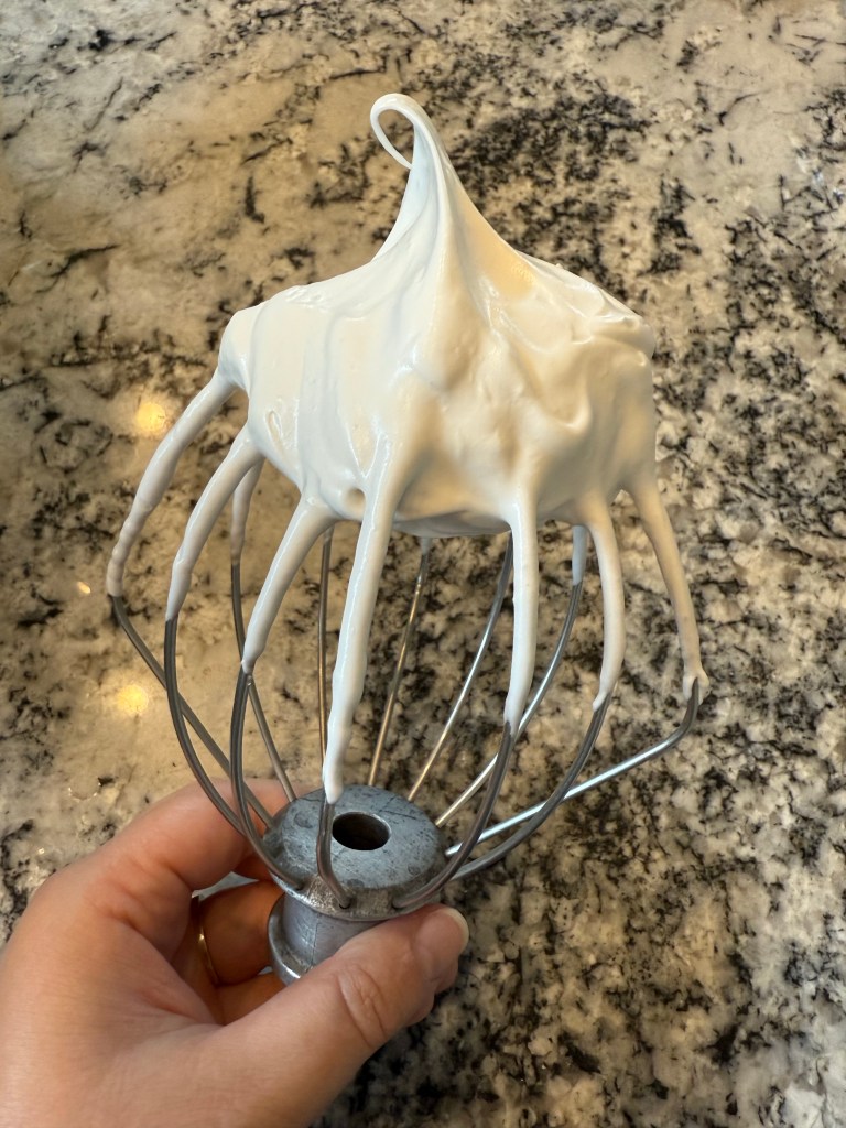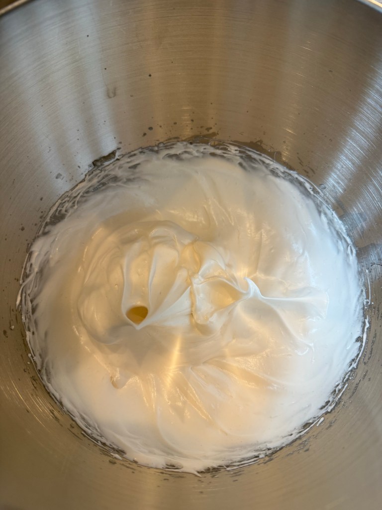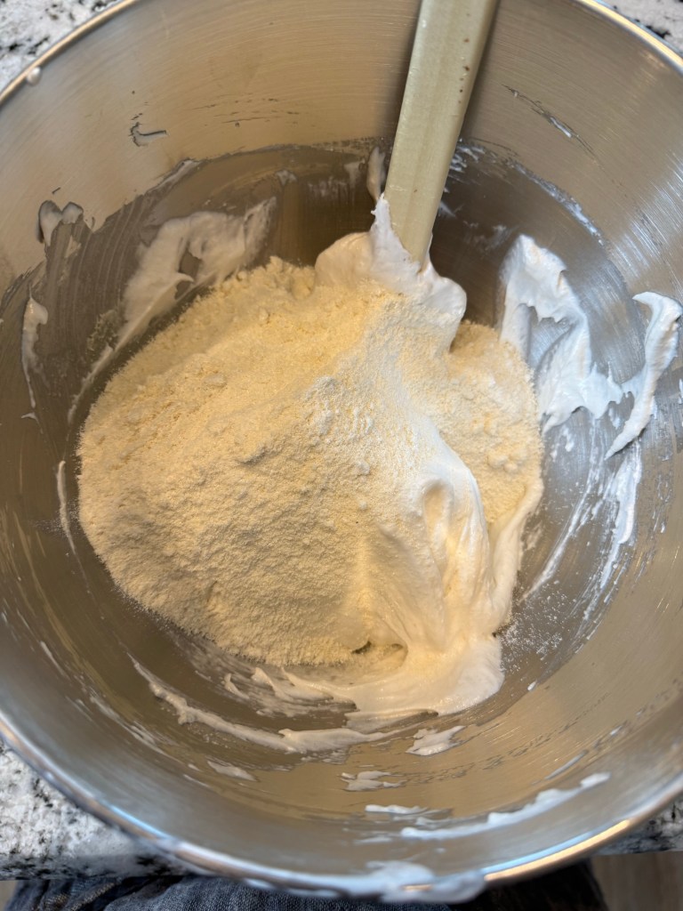 In a separate bowl I whisked the egg whites , salt, and cream of tartar until they were frothy, then turned on the speed on my KitchenAid mixer and slowly poured the granulated sugar in. I continued whipping until the eggs were at stiff peaks.