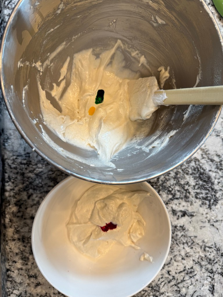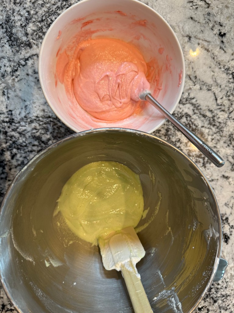I divided the batter in half and added a few drops of food coloring, then folded the color in until the batter was evenly tinted. I also double-checked the macaronage at this point.