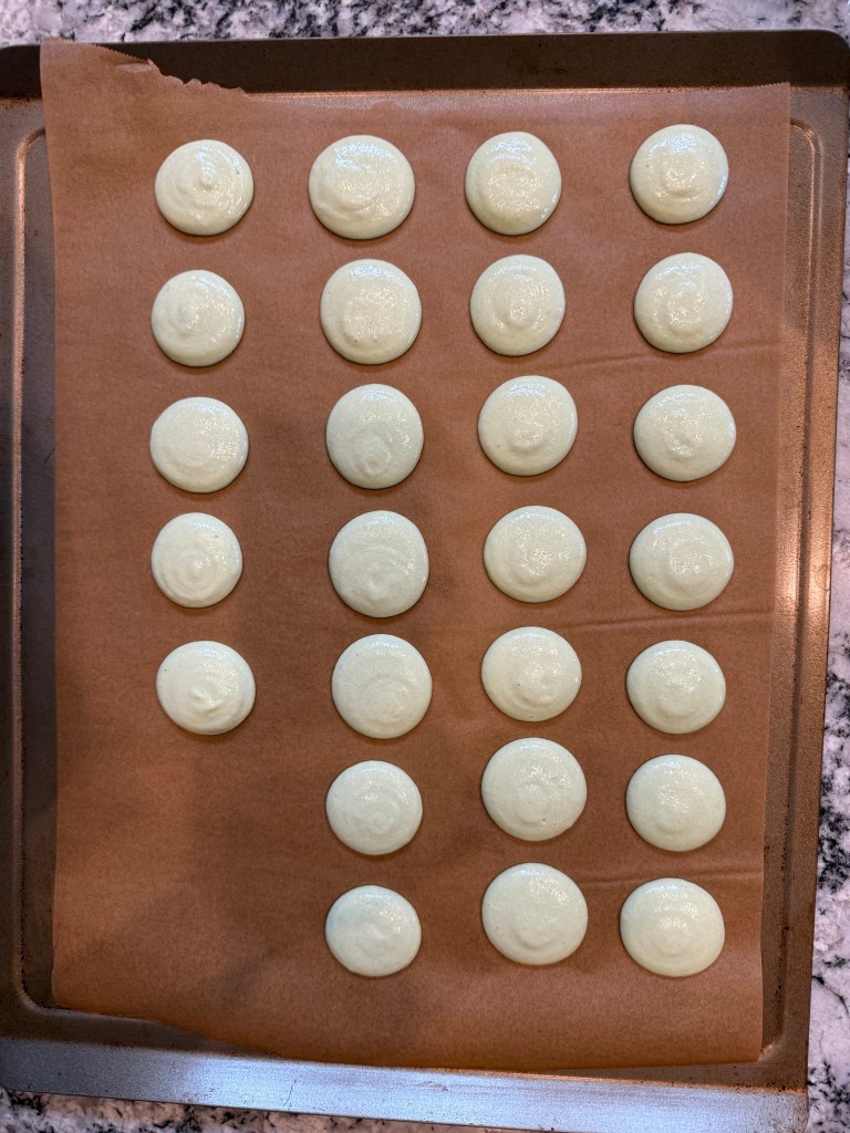 Normally I like to wait for a dry day in the Spring or Autumn to make macarons because the air is dryer, which helps the macaron shells dry more quickly and bake dryer. The day I had set aside for baking these macarons turned out to be a rainy day, so the macarons needed to rest for an hour before the top of each cookie was sufficiently dry to be baked.