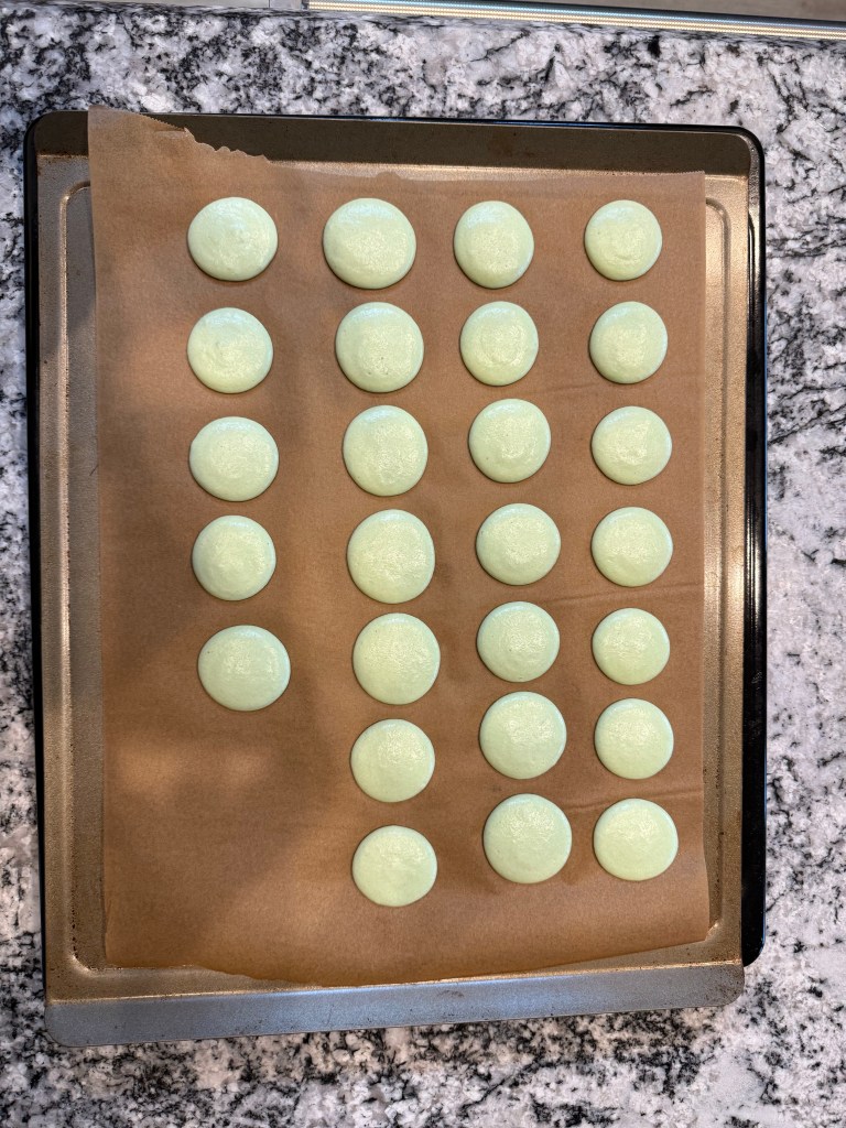I poured both batters into untipped pastry bags, cut the ends of the bags, and piped the macarons.