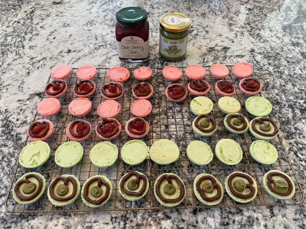 I baked the macaron shells 6 days before my tea party. I put the shells in a container and the container in a plastic bag and froze them until a day or two before the party. On the day of the party I filled them. The green shells got a ring of chocolate buttercream (leftover from decorating my cake) and a dollop of pistachio cream. The pink shells got a ring of chocolate buttercream and a bit of sour cherry jam.