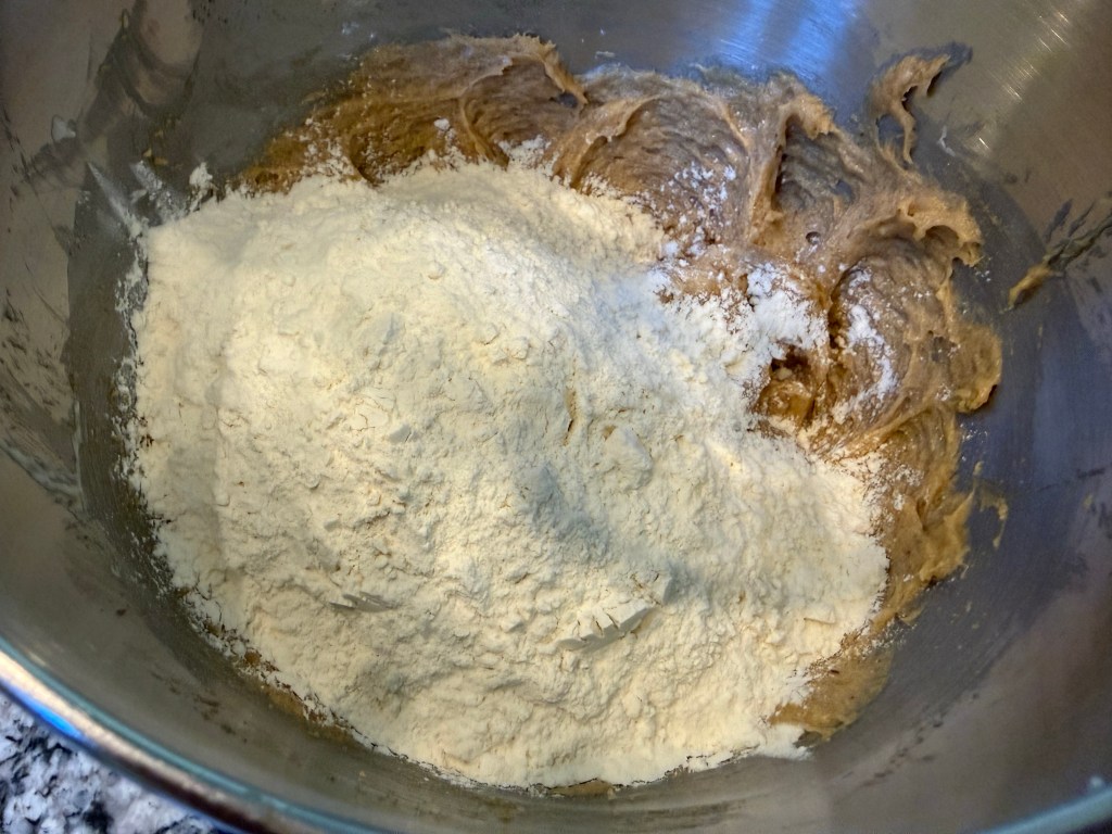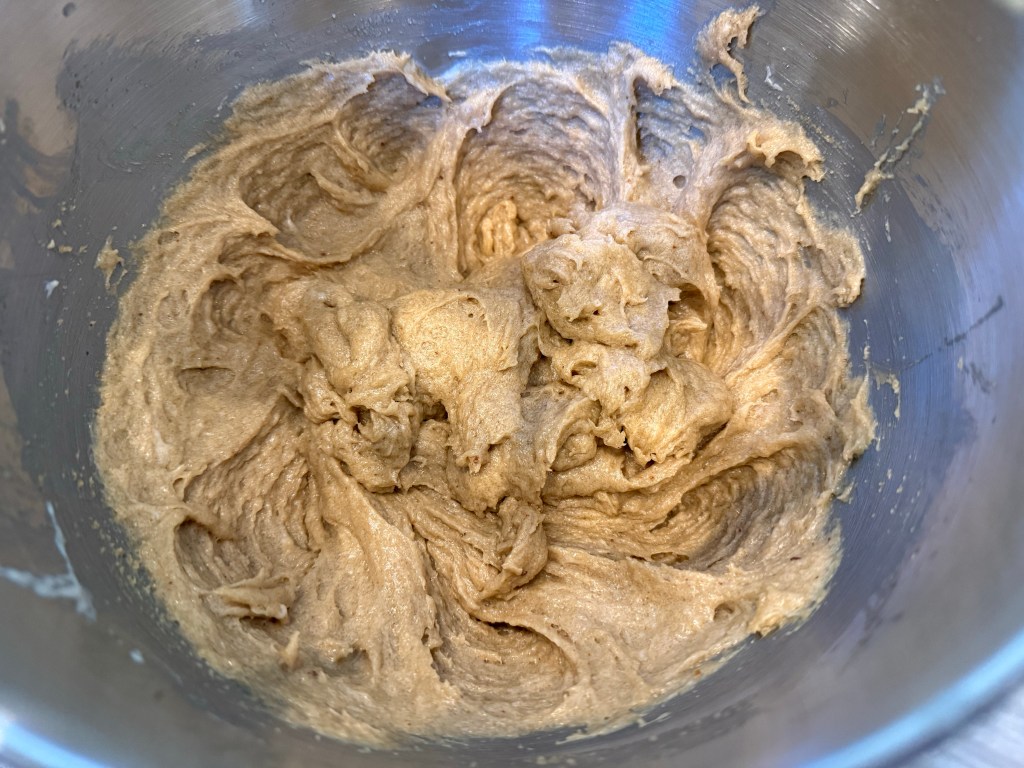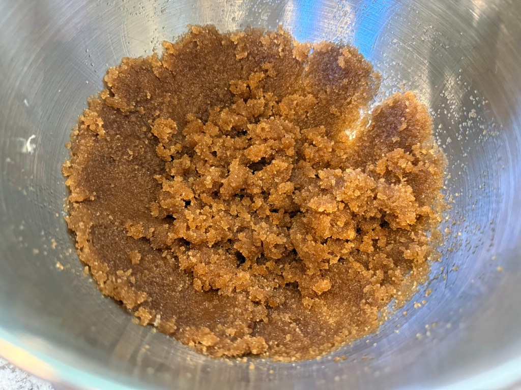 Once the butter was very foamy and the milk solids had browned I let it cool just enough that it would no longer burn me through the bowl. I weighed the browned butter and was tickled pink to see it weigh exactly 185g. I also combined the flour with the leaveners and salt at this stage.