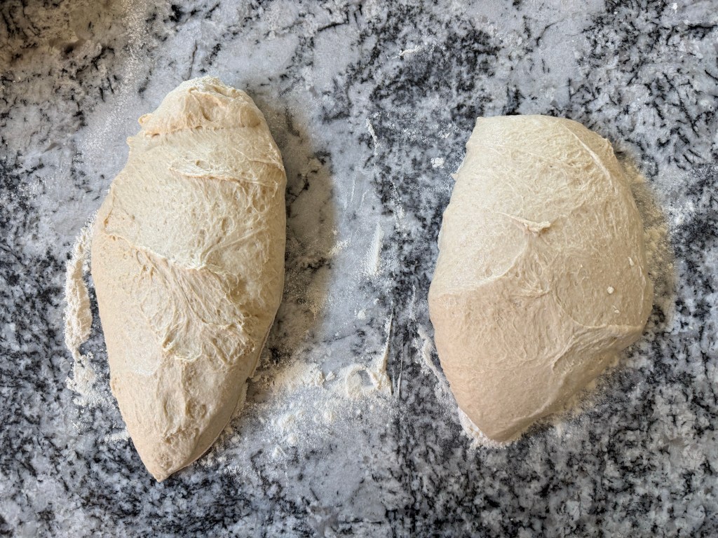 I divided the dough into two and pre-shaped each loaf into a rough round. I covered the rounds and let them rest for 20 minutes.