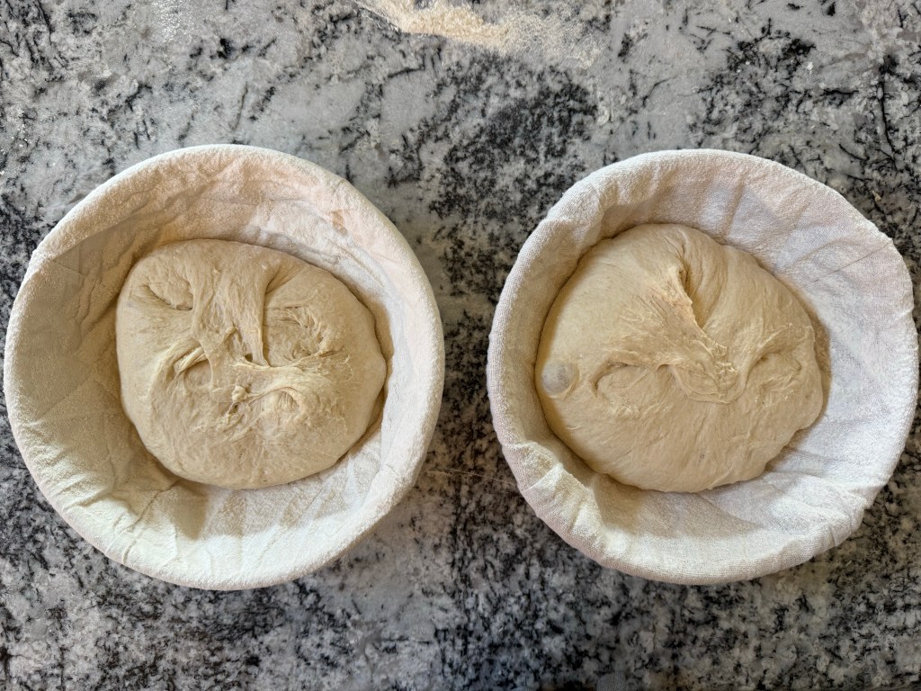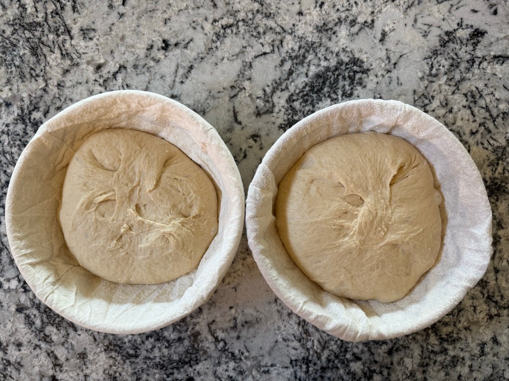 Once the dough had rested I did the final shaping and placed them into bannetons to rise. The final rise was very short – only 30 minutes. I feels odd to allow Sourdough to rise for such a short time, but you can see in the photos that we did get some decent expansion during this period.