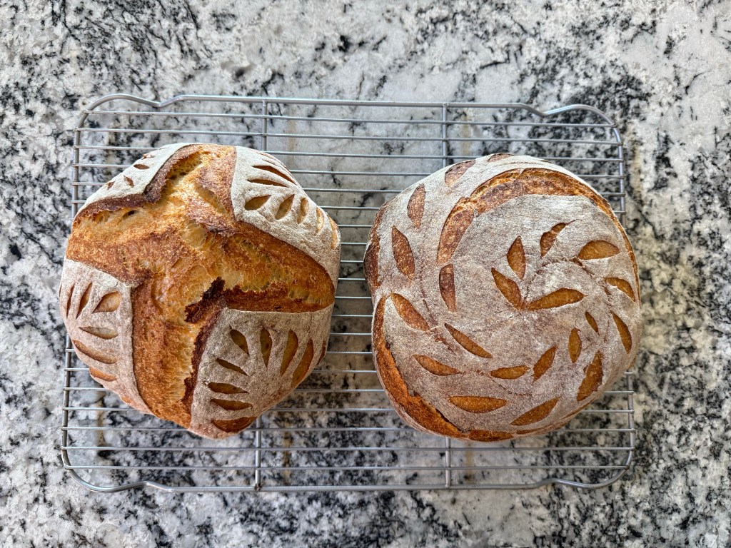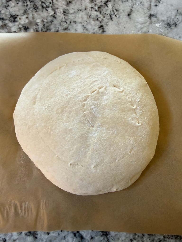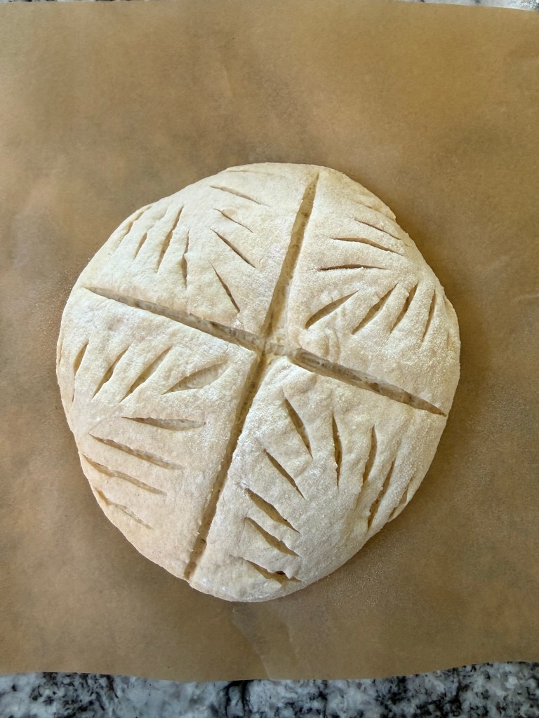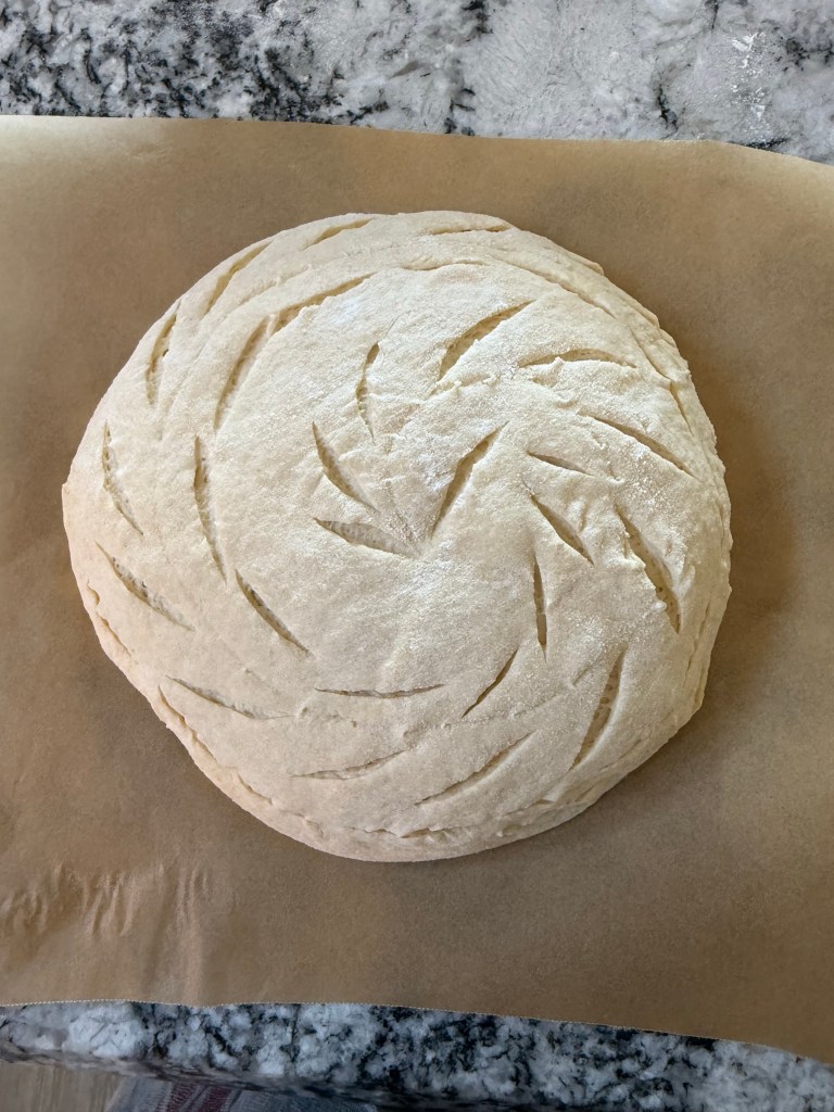 I turned the doughs out onto parchment and scored them before putting them into their baking vessels and into the oven.