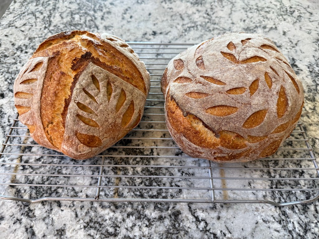 These loaves turned out so beautiful. I love scoring a bread and seeing how it bakes up. It’s a skill I want to practice more. The crumb of the bread is very nice, with small holes evenly distributed throughout the loaf. The bread has good rise and doesn’t taste or feel like a bread with significant whole wheat content.