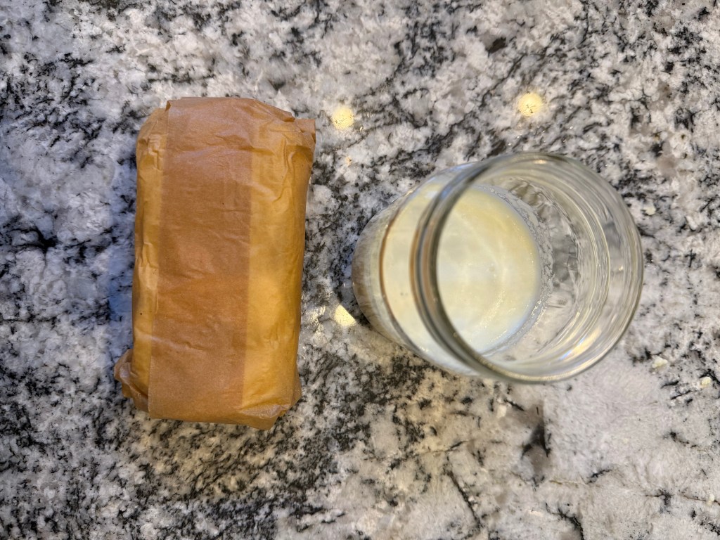 I ended up with a block of butter similar in size to 2 normal sticks of butter (I didn’t weigh it) and ~1/3 cup of uncultured buttermilk.