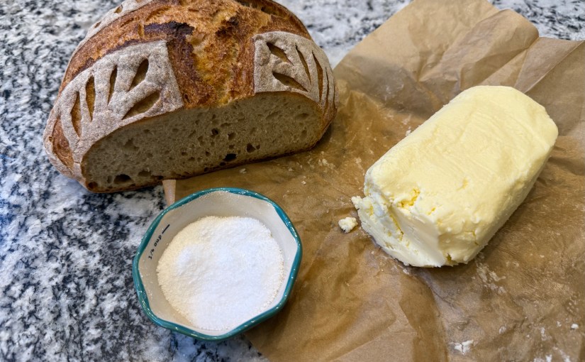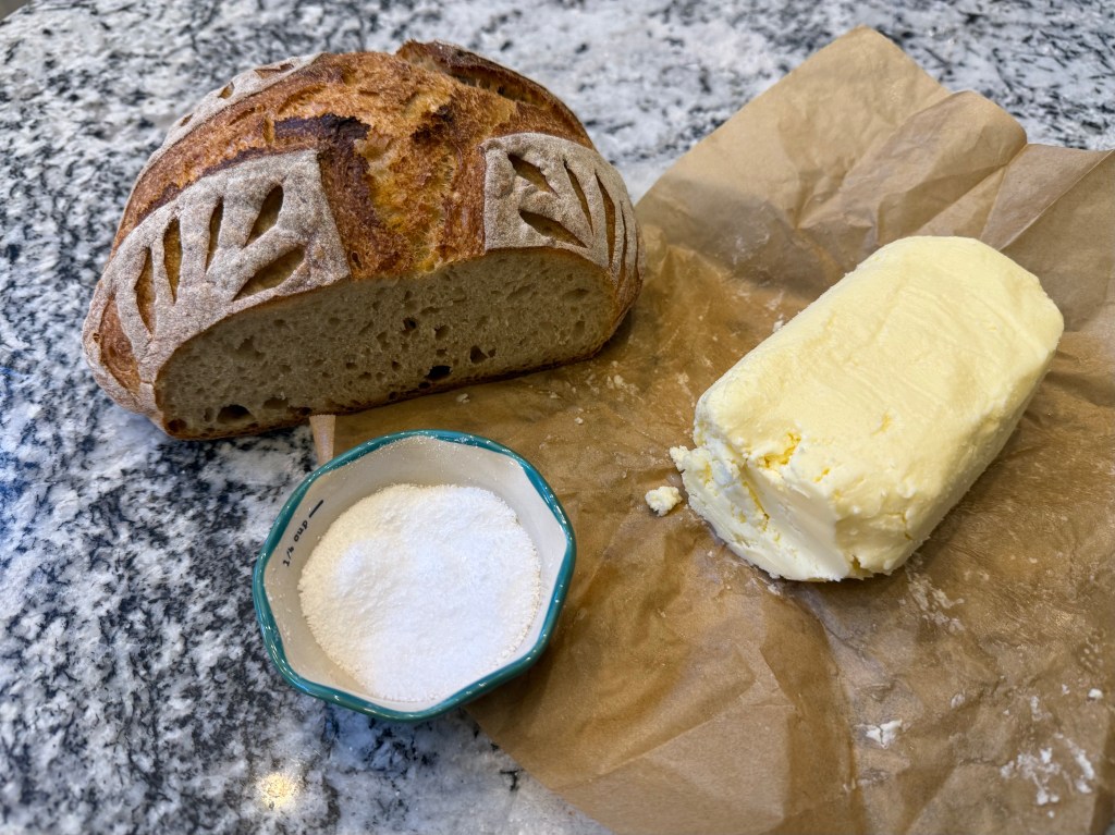 With the bread cooled and the butter made, it was time to taste. The bread is very good: fluffy, and not at all dense. It’s slightly sweet from the honey, and that helps the bread taste a little less sour. This bread is only minimally sour due to the short rising time and warm rising environment.